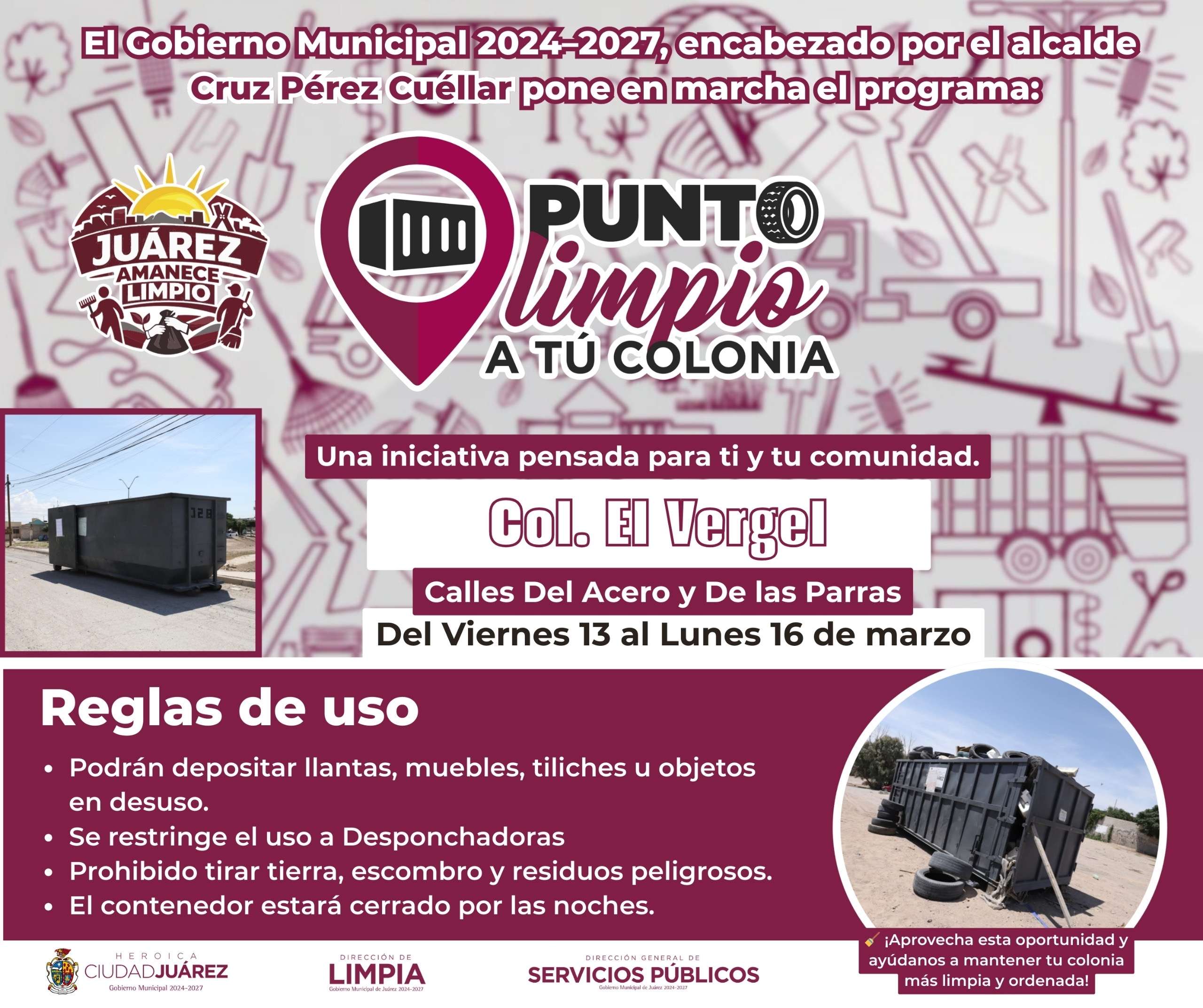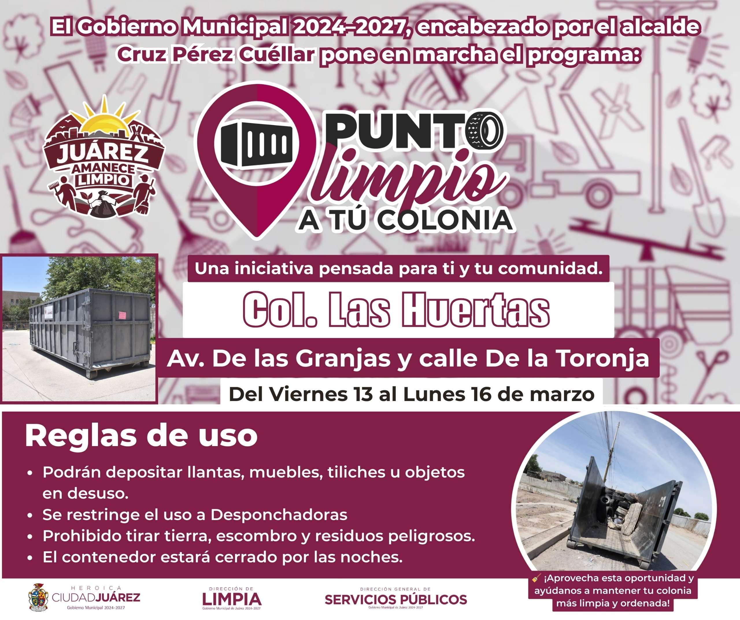 Ciudad Juárez.- La Dirección General de Servicios Públicos Municipales, a través de la Dirección de Limpia, instaló Puntos Limpios a tu Colonia en zonas donde se lleva a cabo el programa Juárez Amanece Limpio, con el objetivo de fortalecer la limpieza urbana y fomentar la correcta disposición de residuos entre la ciudadanía.