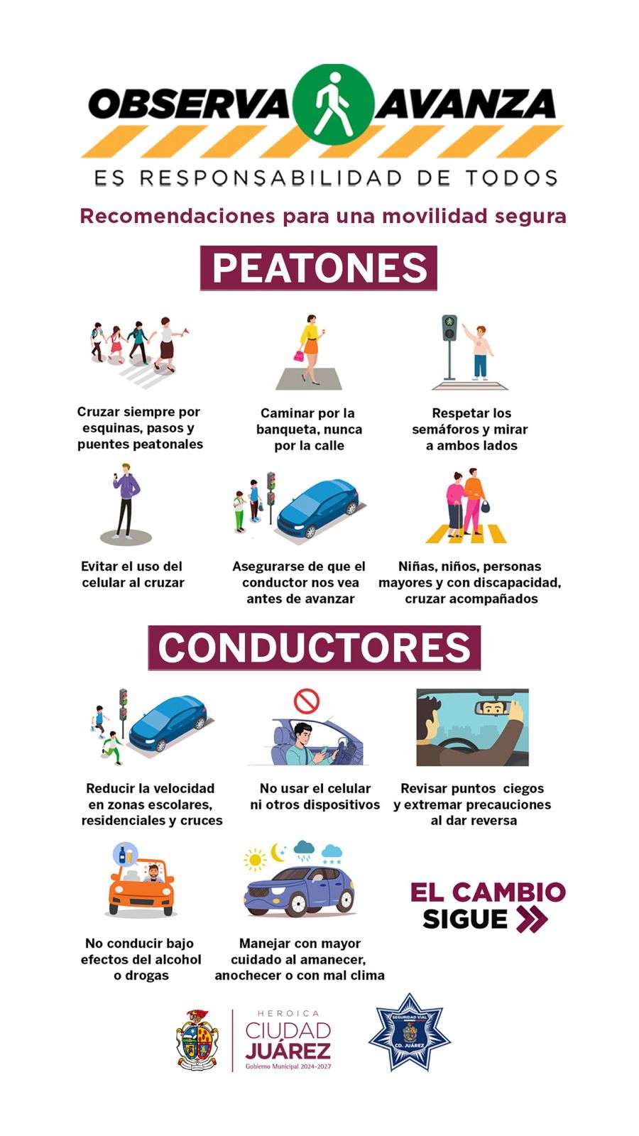 Ciudad Juárez.- Con el fin de disminuir atropellos, la Coordinación General de Seguridad Vial, hace un exhorto a conductores y peatones, para que transiten con precaución; es por ello que a través de la campaña “Observa, avanza”, se emiten recomendaciones que buscan inhibir este tipo de incidencias, con apoyo de la ciudadanía.