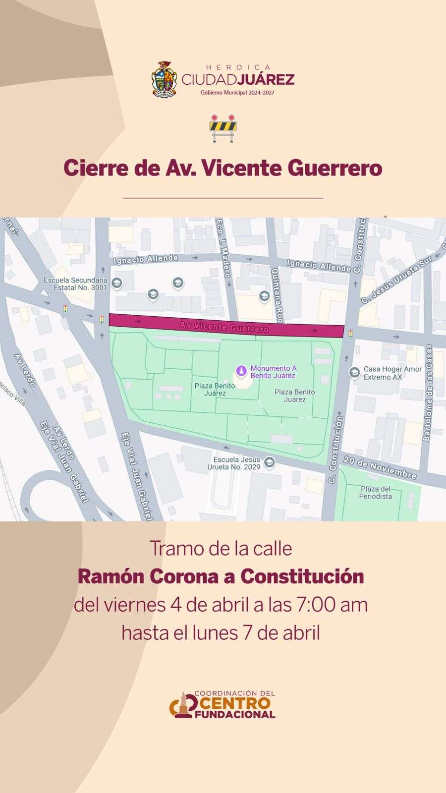 Ciudad Juárez.- La Coordinación del Centro Fundacional del Municipio, recuerda a la ciudadanía tomar precauciones ante el cierre de algunas vialidades derivadas de las actividades que se llevan a cabo como parte del Festival Control.