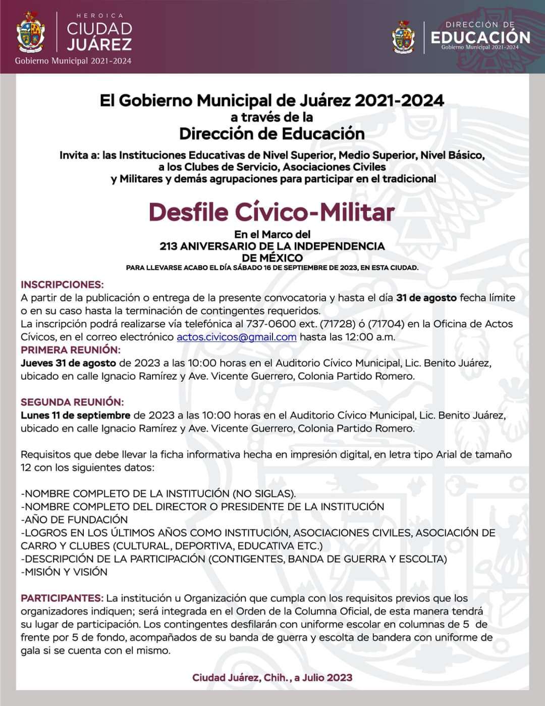Las agrupaciones o escuelas interesadas en participar, pueden consultar las bases en https://www.juarez.gob.mx/eventos_convocatorias/146/convocatoria-del-desfile--cvico-militar/