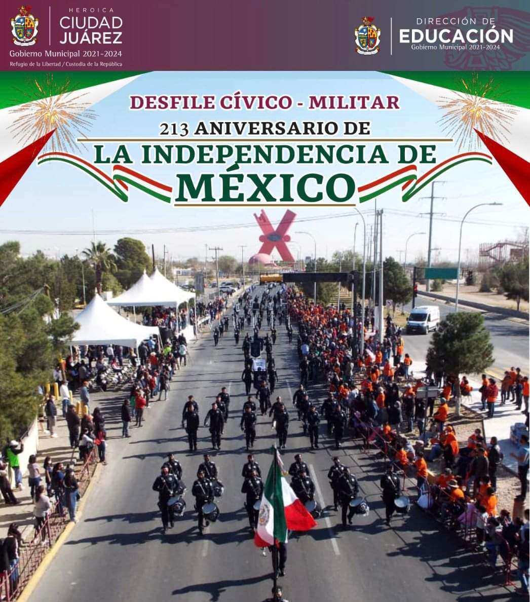 Ciudad Juárez.- La Dirección de Educación Municipal invita a las instituciones educativas, organizaciones y clubes a participar en el Desfile Cívico-Militar para conmemorar el 213 aniversario de la Independencia de México.