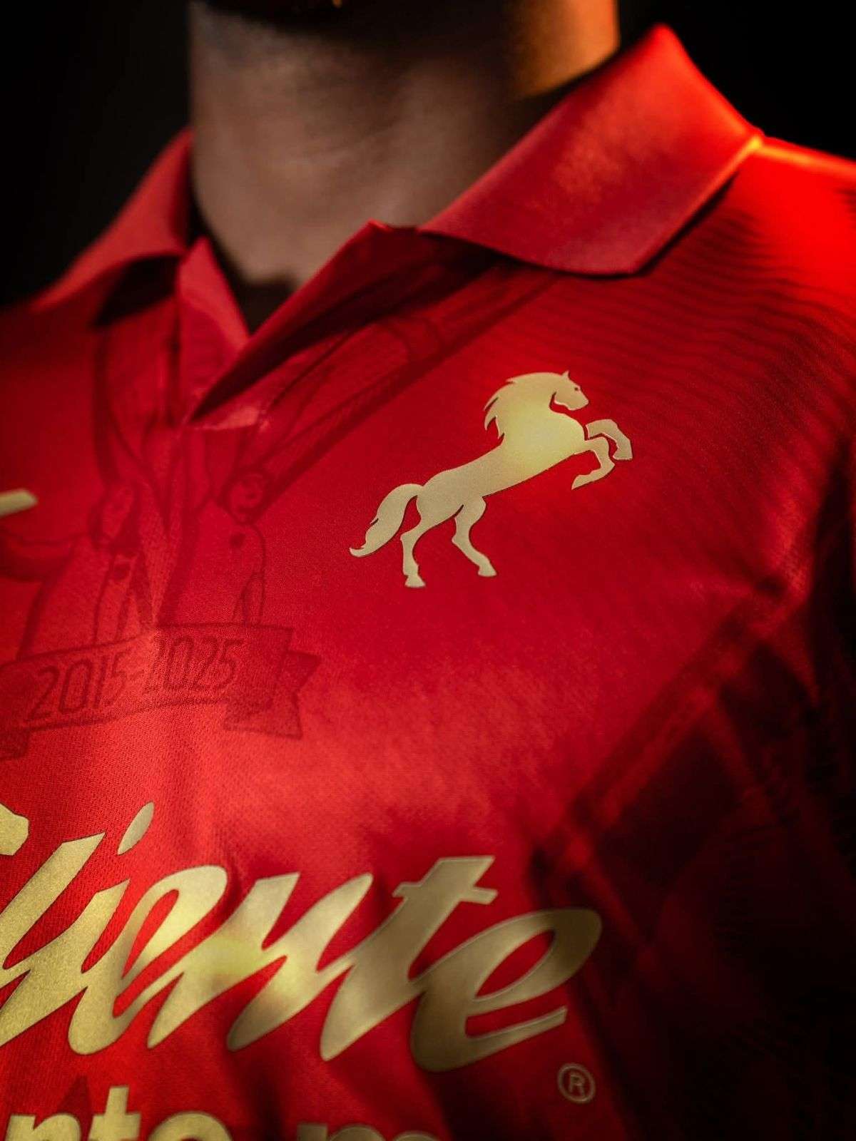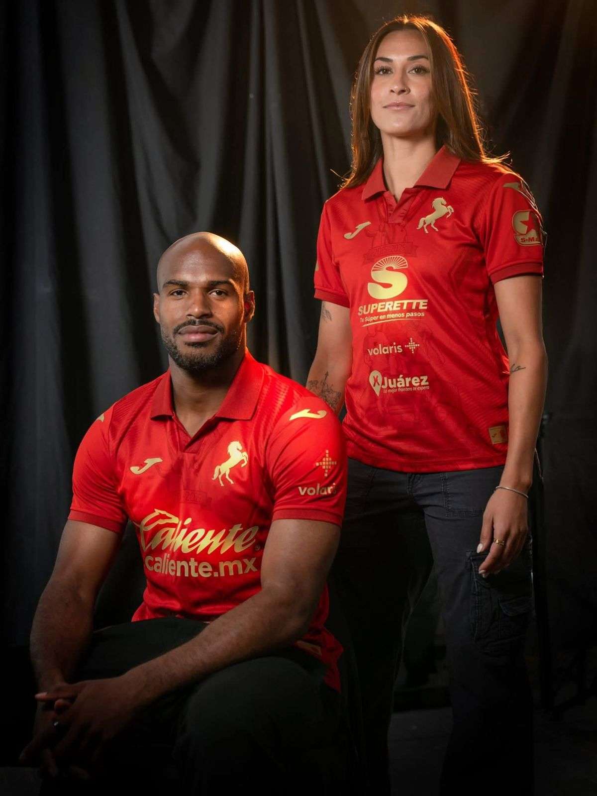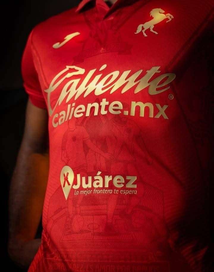 El uniforme destaca por su elegante color rojo y el emblema del caballo en tono dorado, símbolo de fuerza, velocidad y espíritu guerrero que caracteriza a la escuadra juarense.
