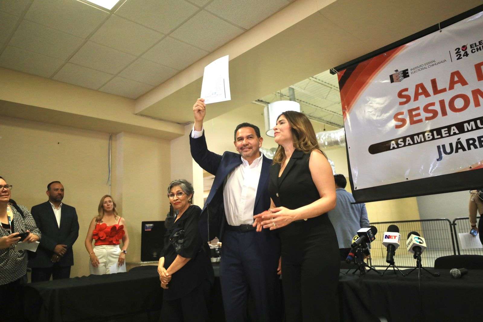 Ciudad Juárez.- Acompañado de su madre la señora Yolanda Cuéllar y su esposa Rubí Enríquez, el Presidente Municipal, Cruz Pérez Cuéllar, recibió la constancia de mayoría en la Asamblea Municipal del Instituto Estatal Electoral que lo acredita como ganador de la elección a Presidente Municipal.
