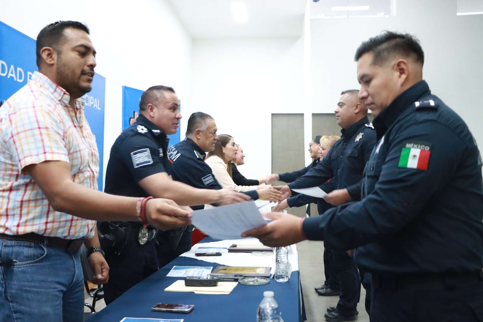 Asimismo, se entregaron reconocimientos a tres policías que cumplieron 10 y 20 años de servicio, mediante la colocación de un pin conmemorativo en honor a su perseverancia y trayectoria. De igual manera, tres agentes que alcanzaron la jubilación fueron homenajeados con una placa de reconocimiento, como muestra de gratitud por los años dedicados a la institución.