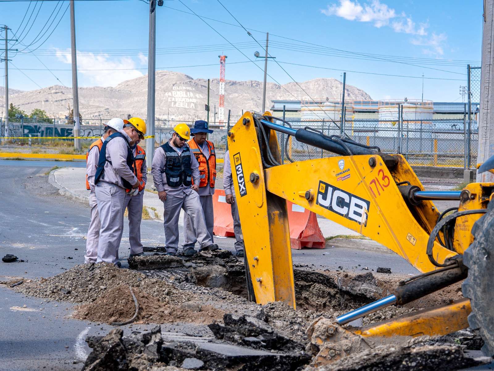 Ciudad Juárez.- La Junta de Agua y Saneamiento de Ciudad Juárez realiza la reparación del colector de 30 pulgadas que cumplió su vida útil y que presentaba un hundimiento expuesto sobre la calle Anáhuac cruce con Eje Vial Juan Gabriel.