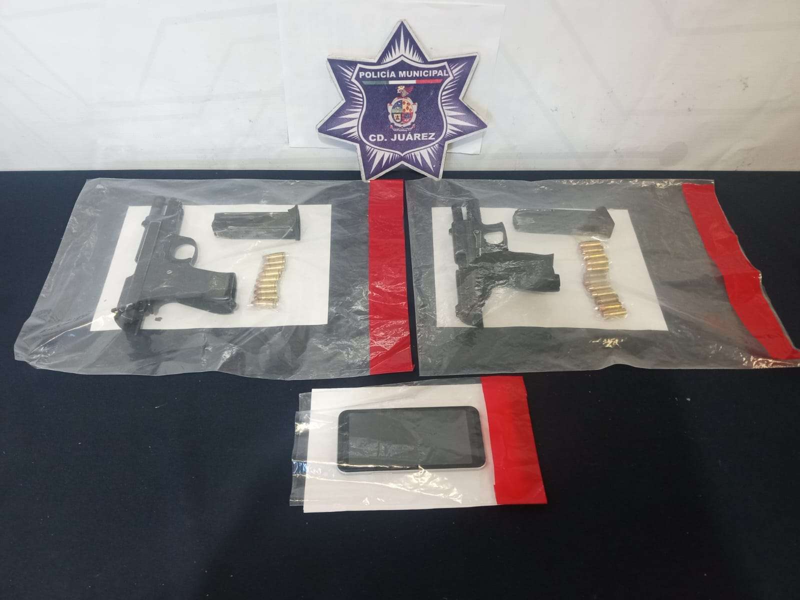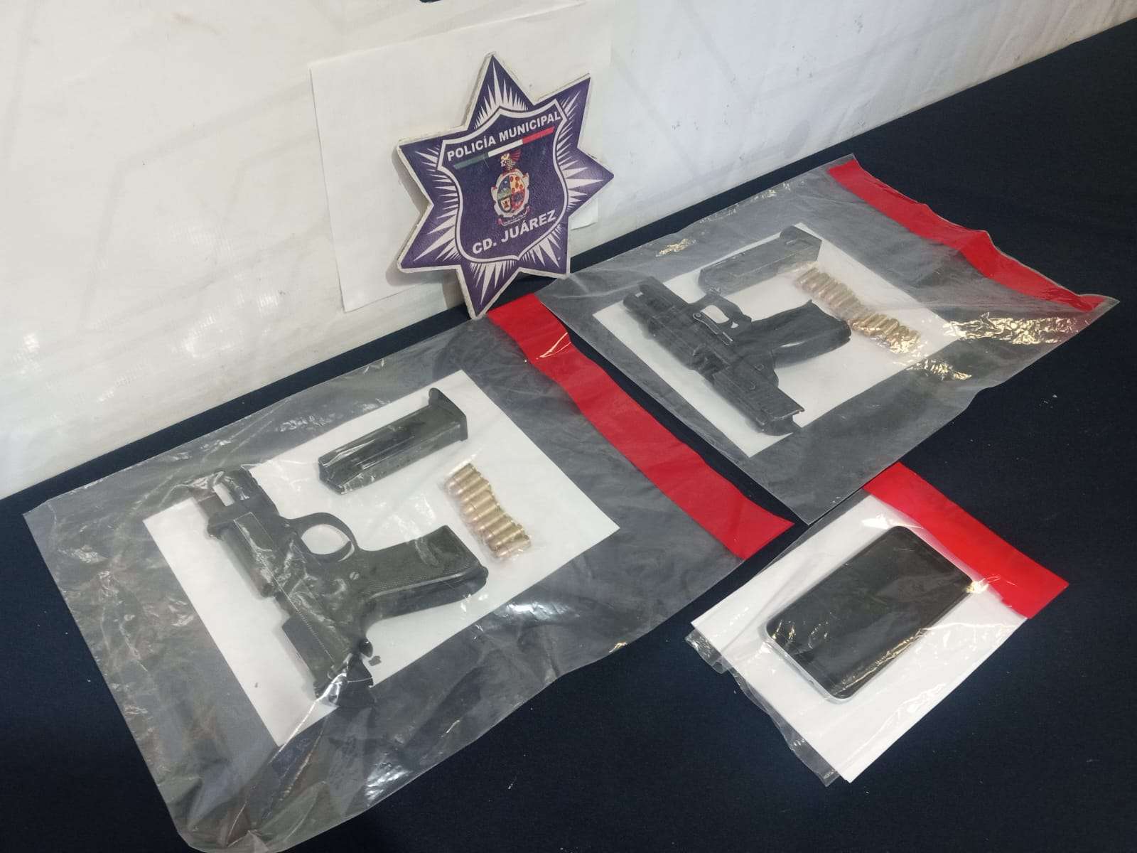 Por lo que ante tal señalización procedieron a la detención de dichas personas y al realizar una inspección preventiva en el domicilio, aseguraron una pistola calibre 9 milímetros, con un cargador abastecido con nueve cartuchos útiles y arma de fuego calibre .40, con un cargador abastecido con 12 cartuchos útiles.