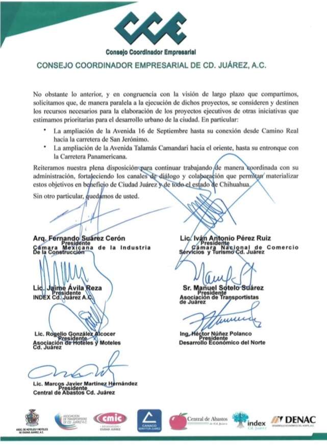 Ciudad Juárez.– El Consejo Coordinador Empresarial de Ciudad Juárez (CCE) manifestó su respaldo a la estrategia de inversión en infraestructura impulsada por el Gobierno del Estado, al tiempo que solicitó ampliar la visión de desarrollo urbano con nuevos proyectos prioritarios para la ciudad.