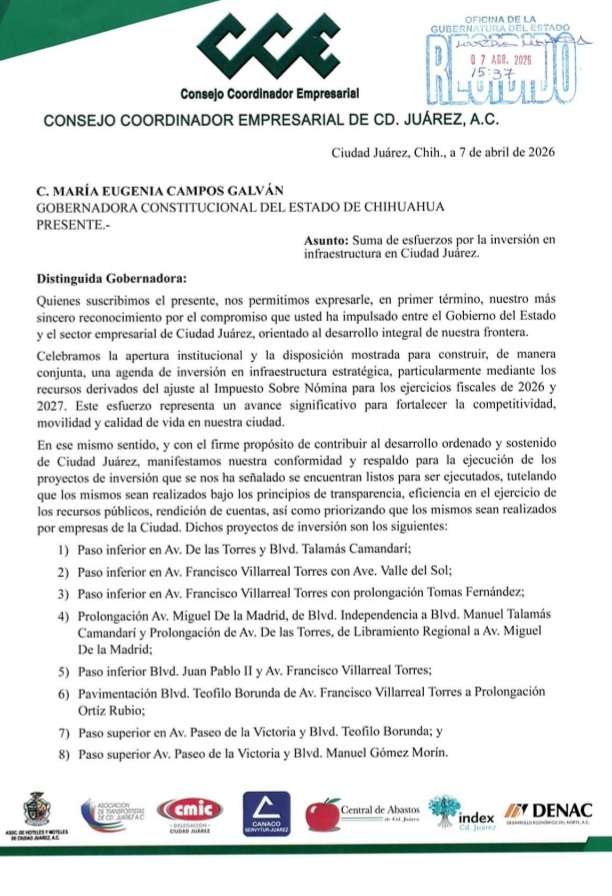 Finalmente, el Consejo Coordinador Empresarial de Ciudad Juárez reiteró su disposición para mantener una colaboración estrecha con el Gobierno del Estado, fortaleciendo los mecanismos de diálogo que permitan concretar proyectos de alto impacto en beneficio de la frontera.