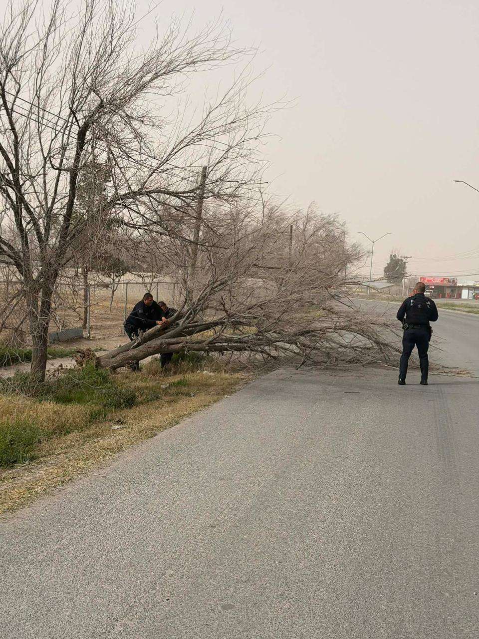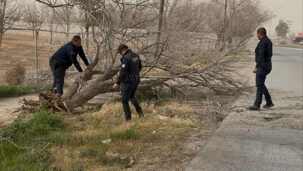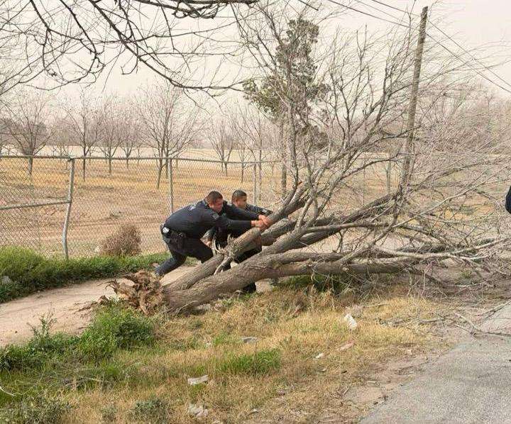Ciudad Juárez.- Ante la contingencia generada por los fuertes vientos registrados en las últimas horas, elementos de la Secretaría de Seguridad Pública Municipal (SSPM) llevaron a cabo recorridos preventivos en las vialidades con mayor tránsito vehicular y peatonal, así como acciones para el retiro de árboles y objetos que representaban riesgo para la ciudadanía.