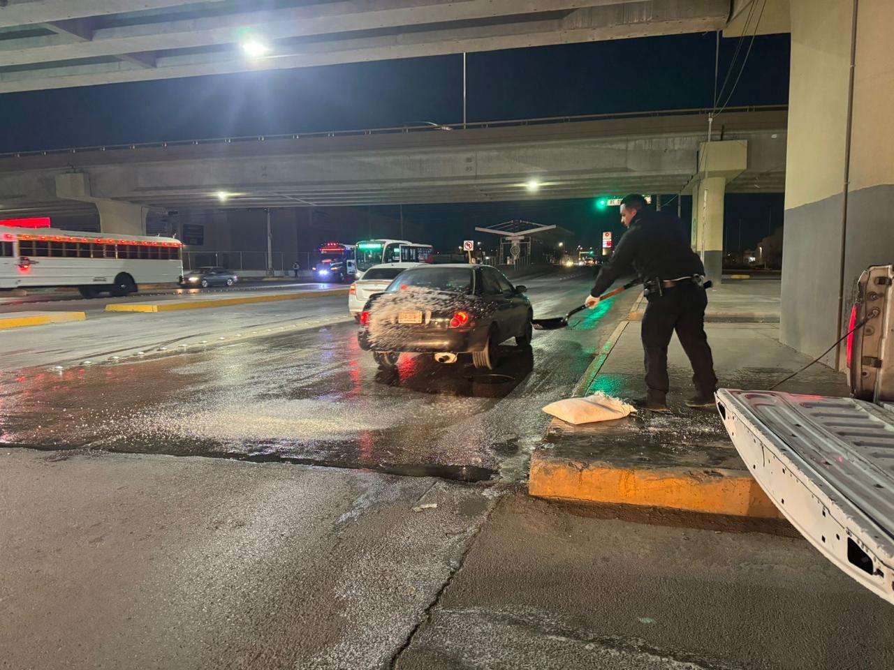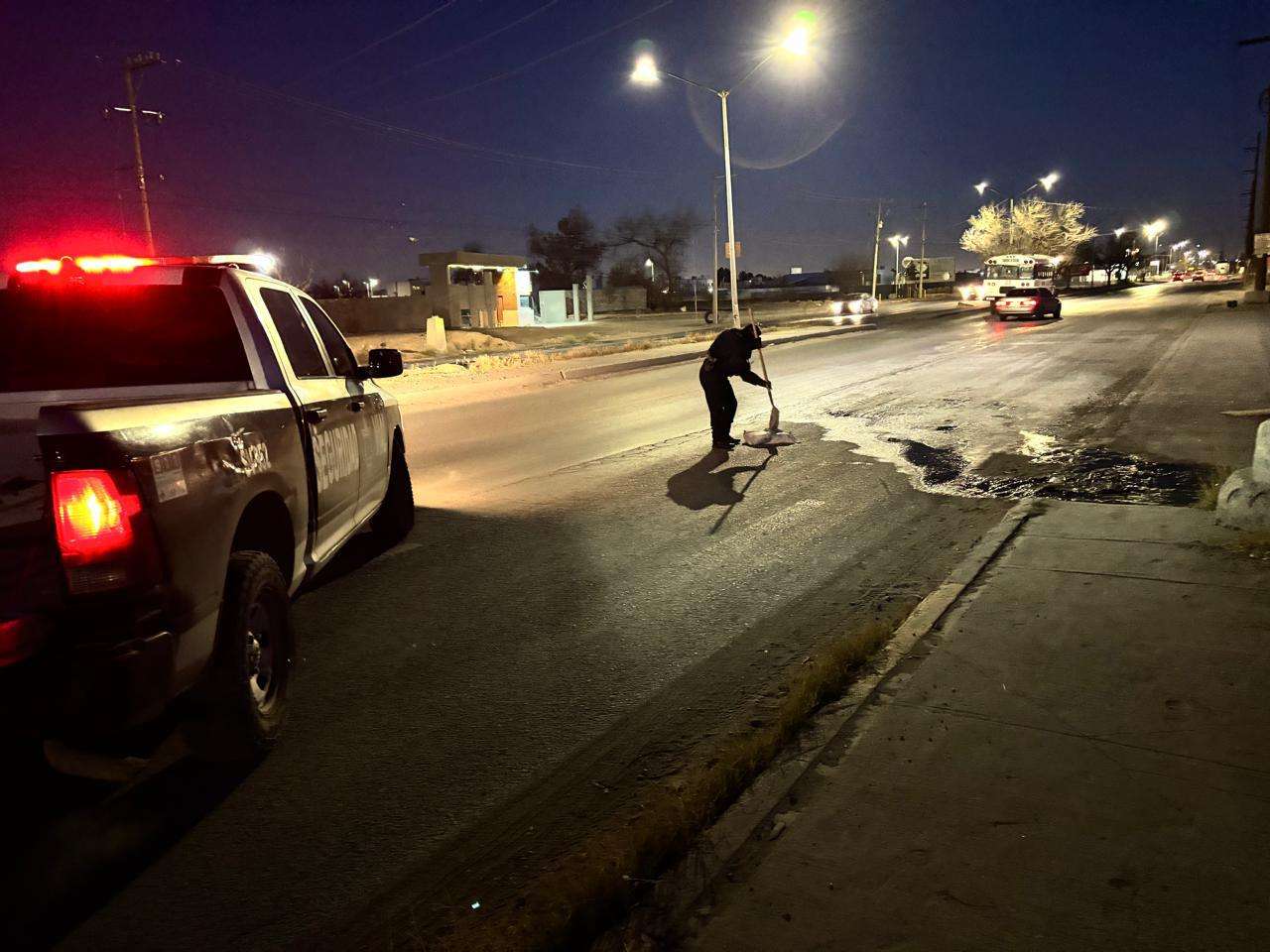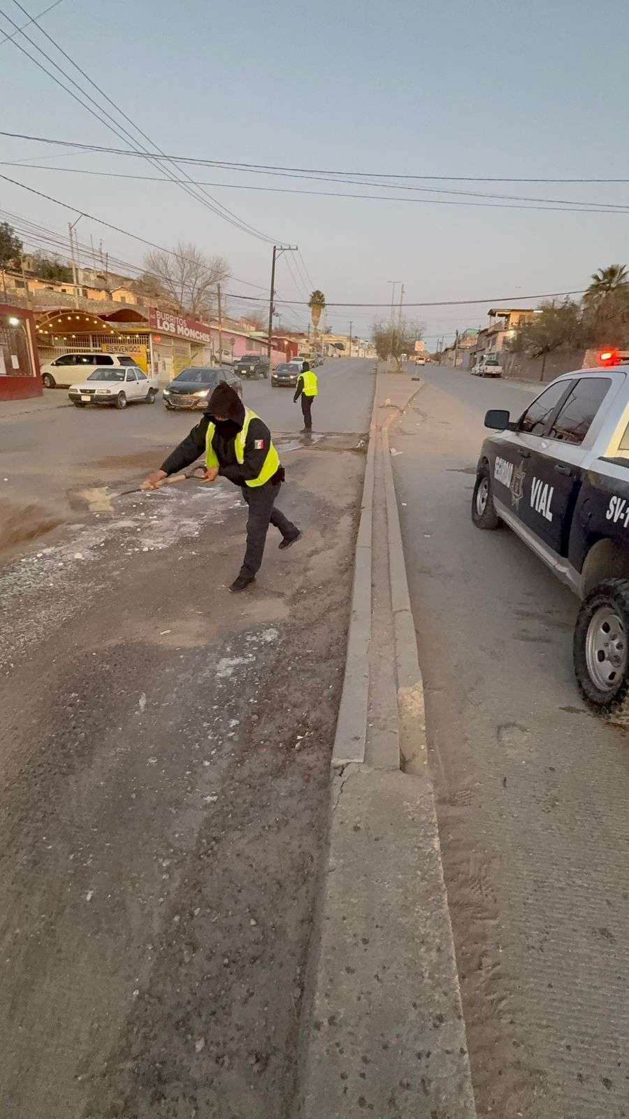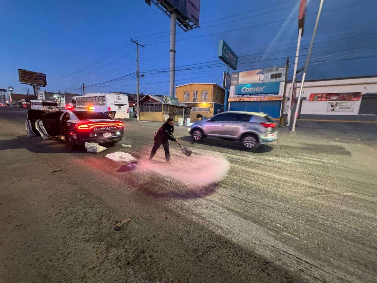 Ciudad Juárez.- Como parte de las labores preventivas que realiza la Coordinación General de Seguridad Vial, durante los patrullajes que realizan los agentes esparcieron sal y arena en vialidades que representaban algún peligro para el tránsito, debido a la cristalización que se presentó derivado de las bajas temperaturas.