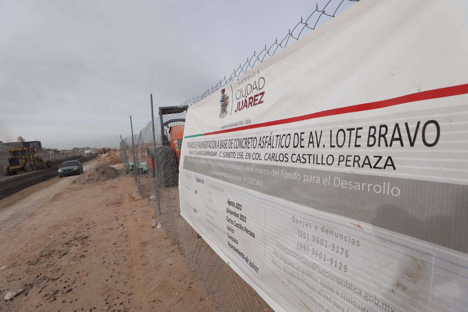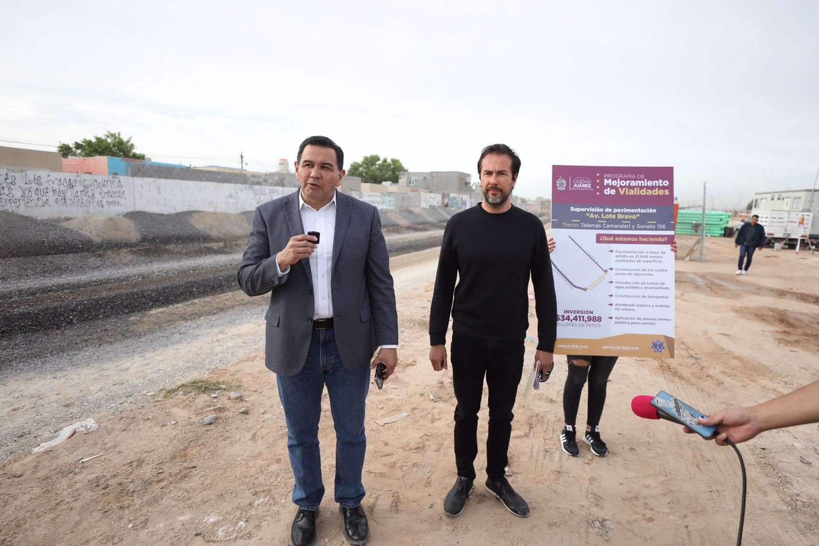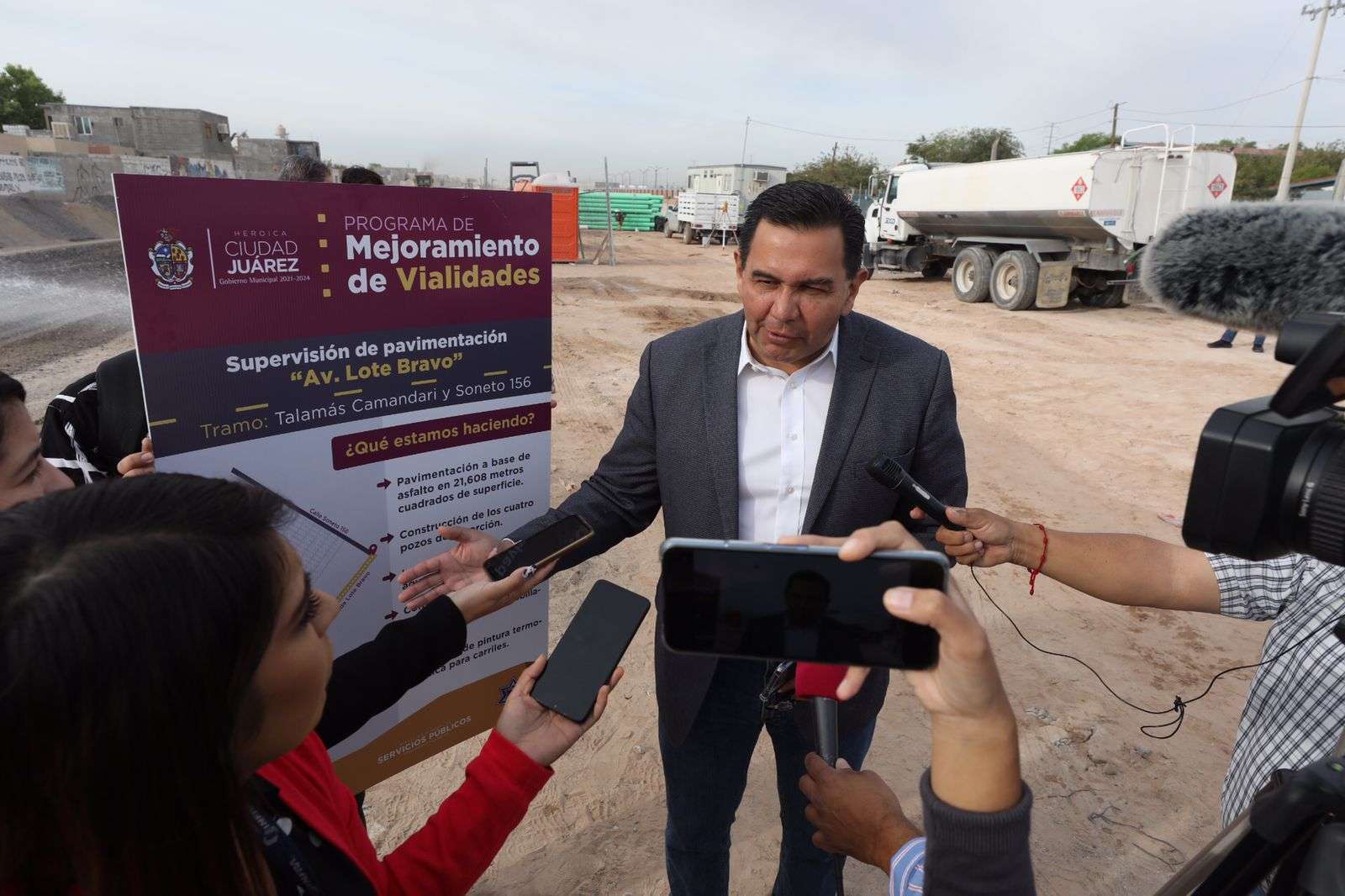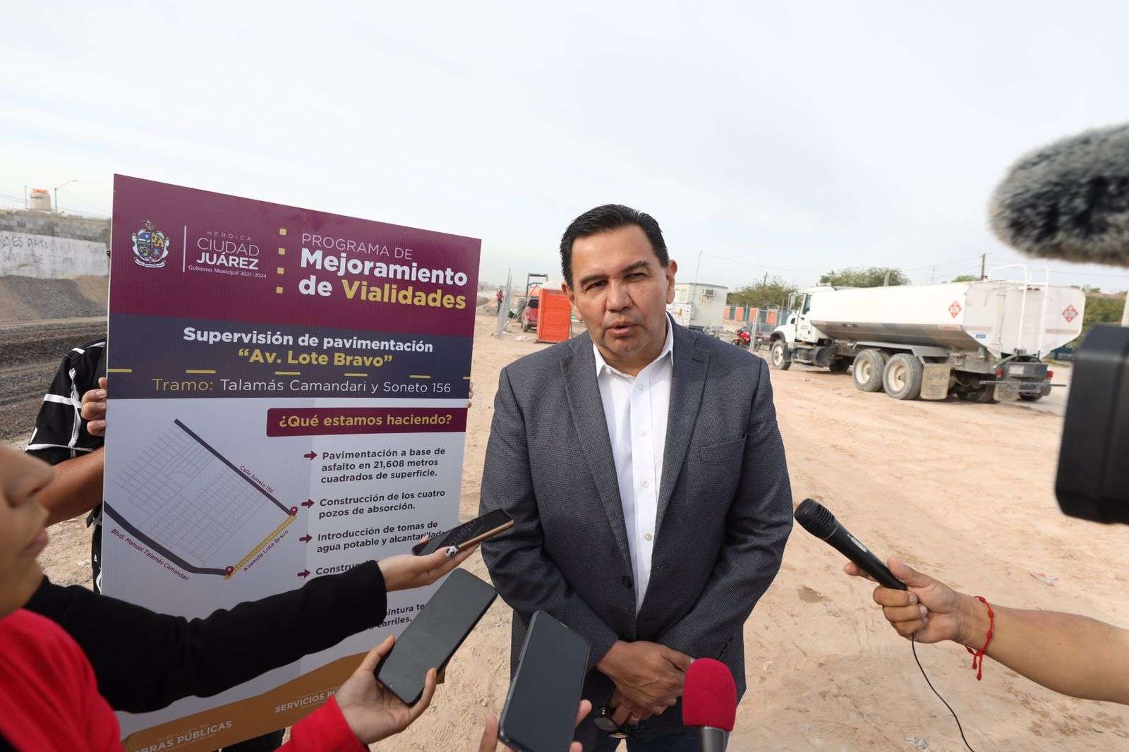 Ciudad Juárez.- Esta mañana el Presidente Municipal, Cruz Pérez Cuéllar, estuvo en las inmediaciones de la avenida Lote Bravo para supervisar los trabajos que realiza la Dirección General de Obras Públicas para la pavimentación de dicha arteria en el suroriente de la ciudad.