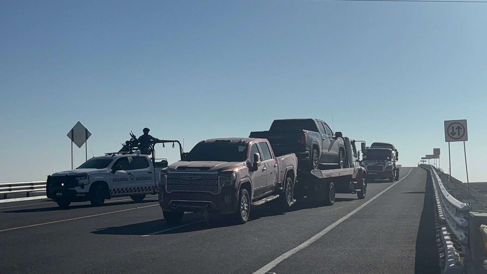 En la zona fueron halladas un Barrett, calibre 50, 15 fusiles de asalto, 8 pistolas, chalecos y cascos tácticos, cargadores y cartuchos de diferente calibre, además de 3 vehículos abandonados; una GMC pick up Denali color rojo, una Ford color blanca y una GMC Sierra color negro.