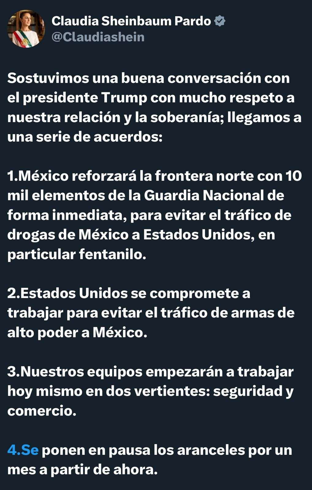 CdMx.- La Presidenta de México, Claudia Sheinbaum, anunció esta mañana que los aranceles se ponen en pausa por un mes, a partir de hoy.
