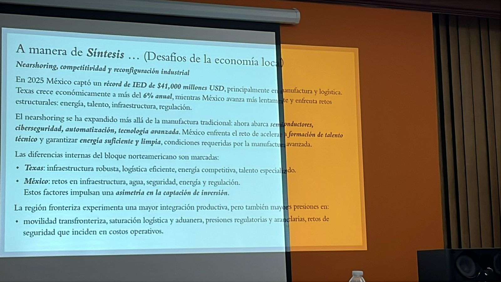 La exposición se estructuró en tres niveles: primero, el contexto internacional; después, el impacto en México y Chihuahua; y finalmente, las implicaciones directas para Ciudad Juárez.