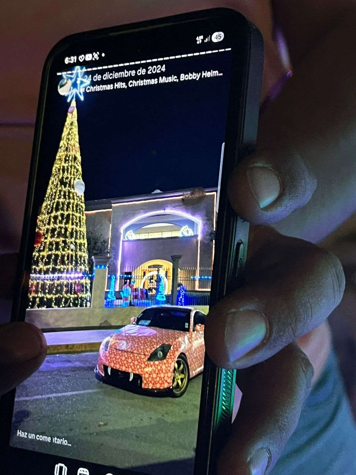 Incluso en reposo, el automóvil continúa cumpliendo su propósito. Estacionado a las afueras de su vivienda, ilumina el entorno y se convierte en un punto de referencia que anuncia la llegada de las fiestas decembrinas, reforzando el ambiente festivo del vecindario.