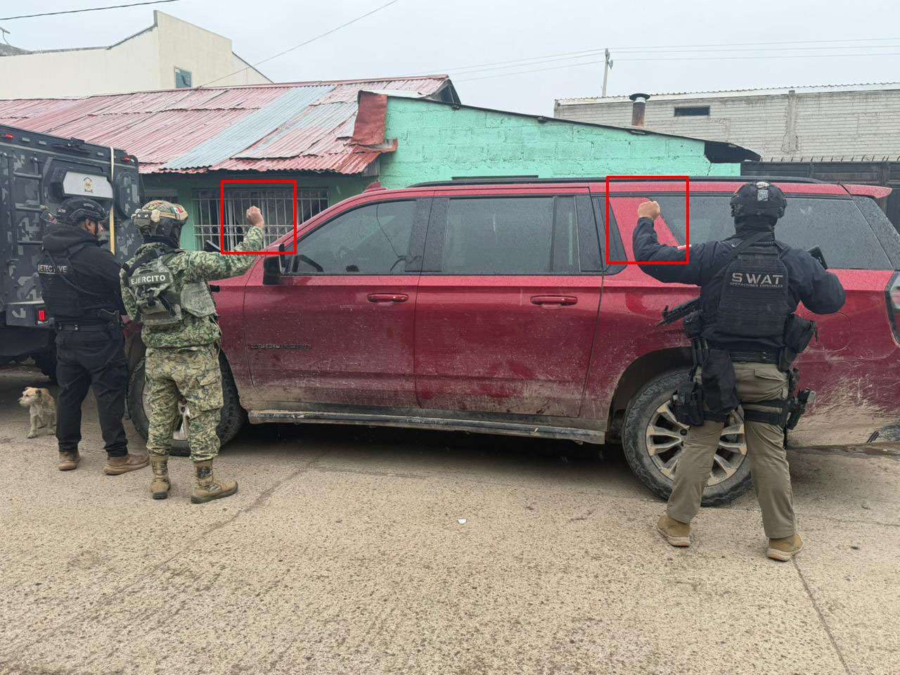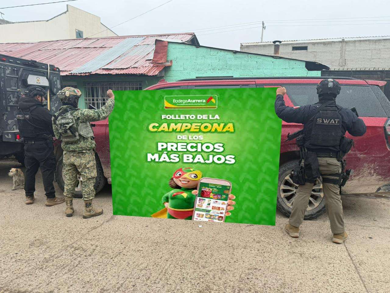 Resulta que la Secretaría de Seguridad Pública del Estado envió información y fotos del aseguramiento de dos vehículos que tenían reporte de robo y en una de las gráficas estaban un soldado y un policía del Swat levantando la mano, como deteniendo una lona que normalmente le ponen con los logos de la corporación.