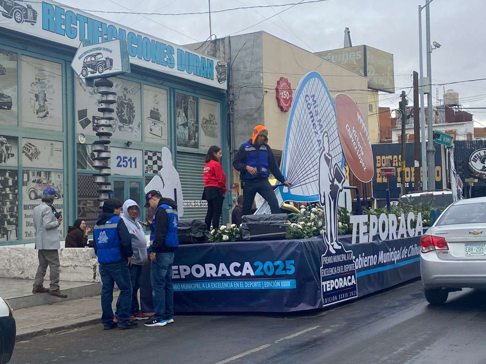 Chihuahua.- Vehículos alegóricos así como los deportistas que participaron y ganaron en el premio municipal a la excelencia en el deporte los premios teporaca 2025 se encuentran ultimando detalles para dar inicio con el tradicional desfile.