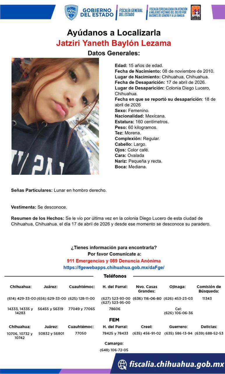 Chihuahua. - La Fiscalía General del Estado de Chihuahua ha emitido una ficha de búsqueda oficial para localizar a Jatziri Yaneth Baylón Lezama, una adolescente de 15 años de edad, quien fue reportada como desaparecida recientemente en la capital del estado. Según el reporte de las autoridades, la joven fue vista por última vez el pasado 17 de abril de 2026 en la colonia Diego Lucero, y desde ese momento se desconoce su paradero actual.