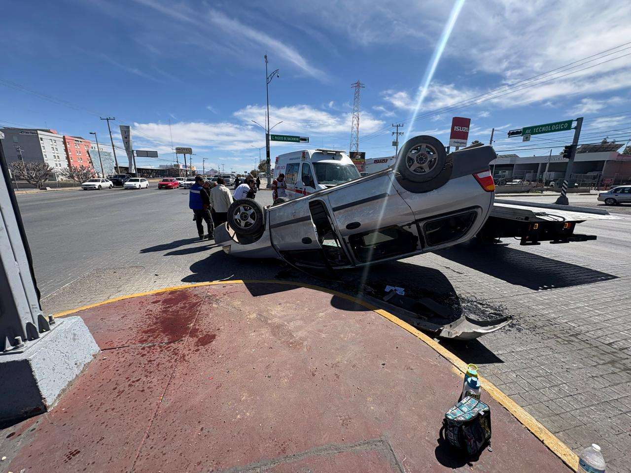 Chihuahua.- Una mujer y un menor de edad resultaron lesionados tras protagonizar un aparatoso choque con volcadura en el cruce de la avenida Tecnológico y Paseos de Bachíniva, en la colonia Paseos de Chihuahua.