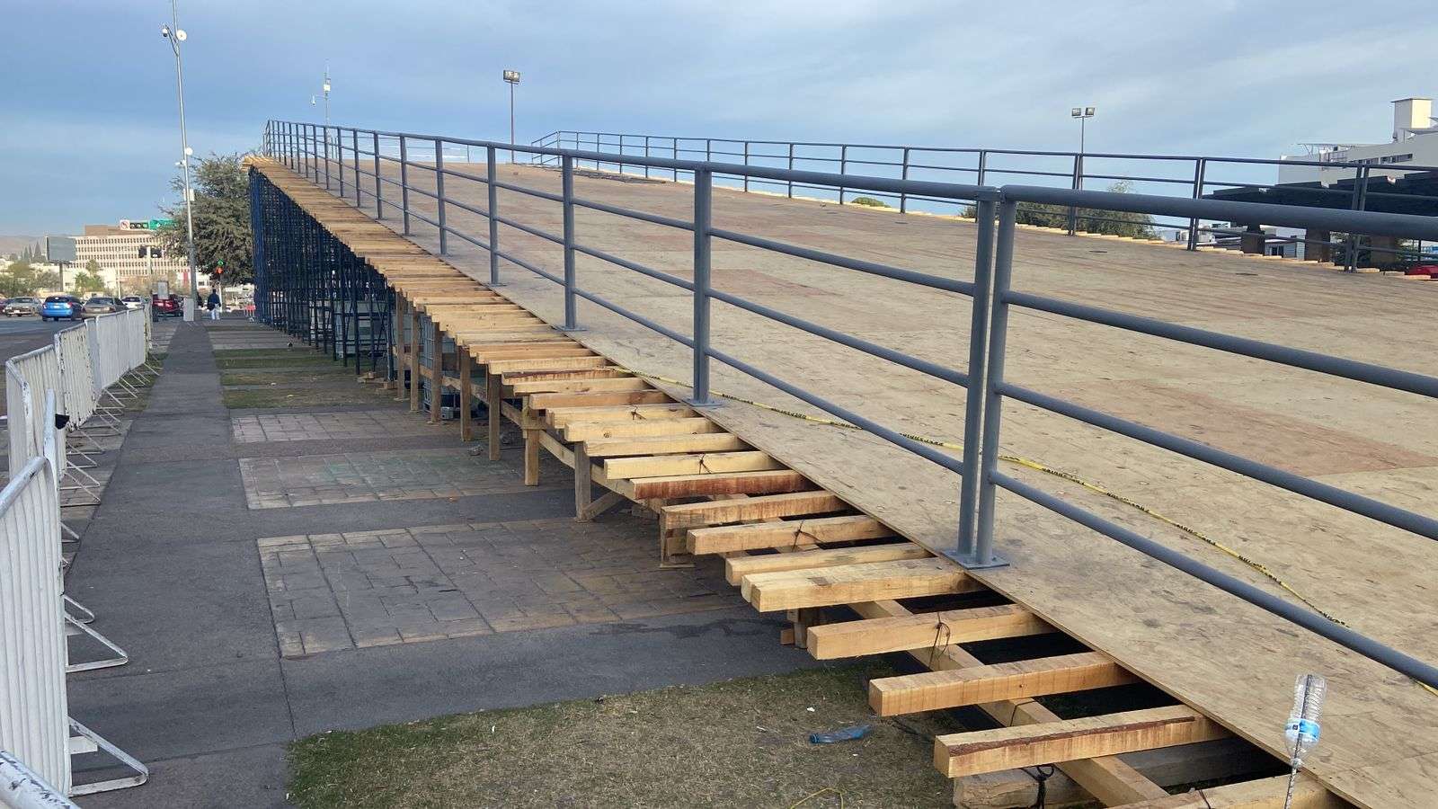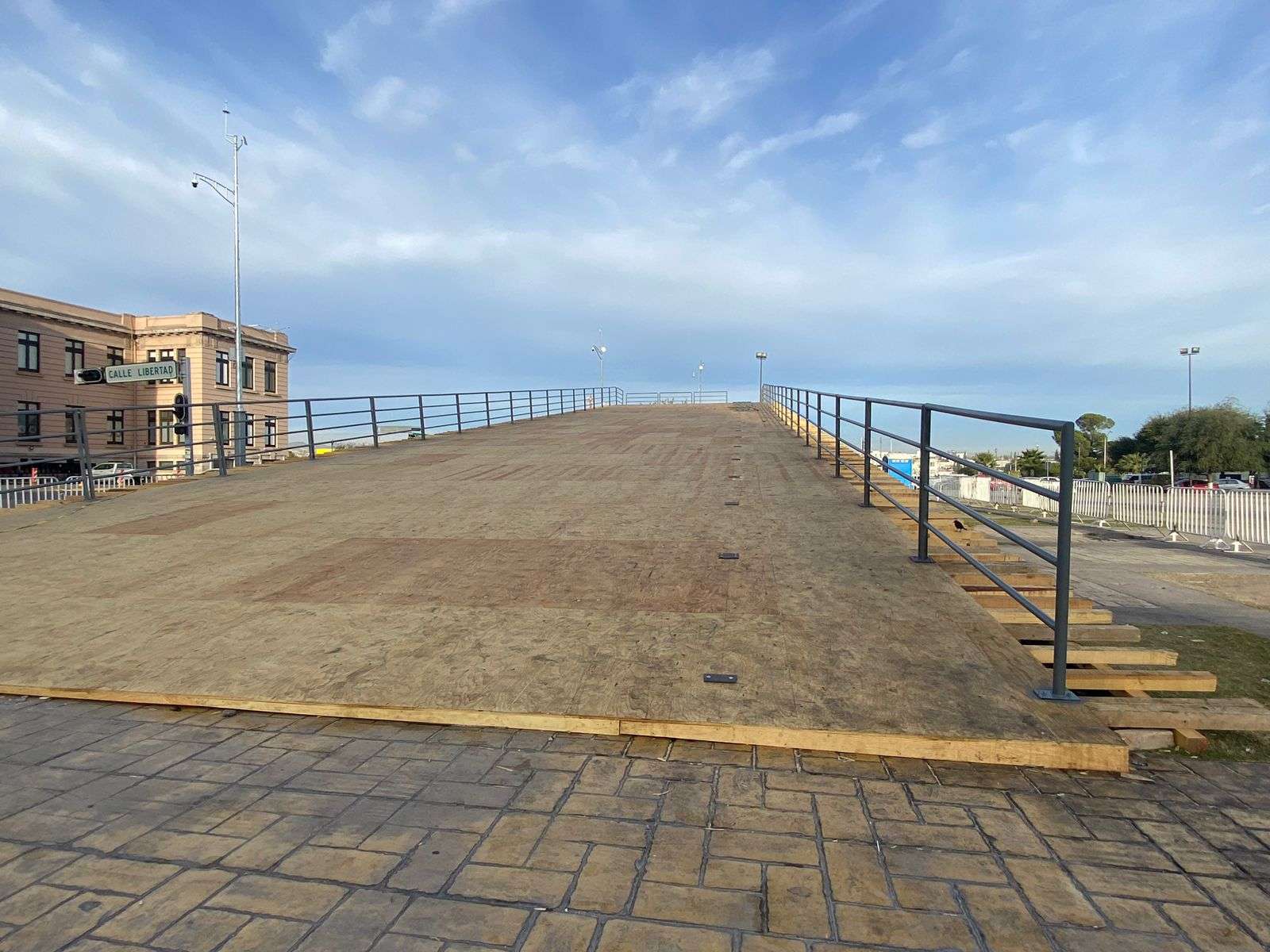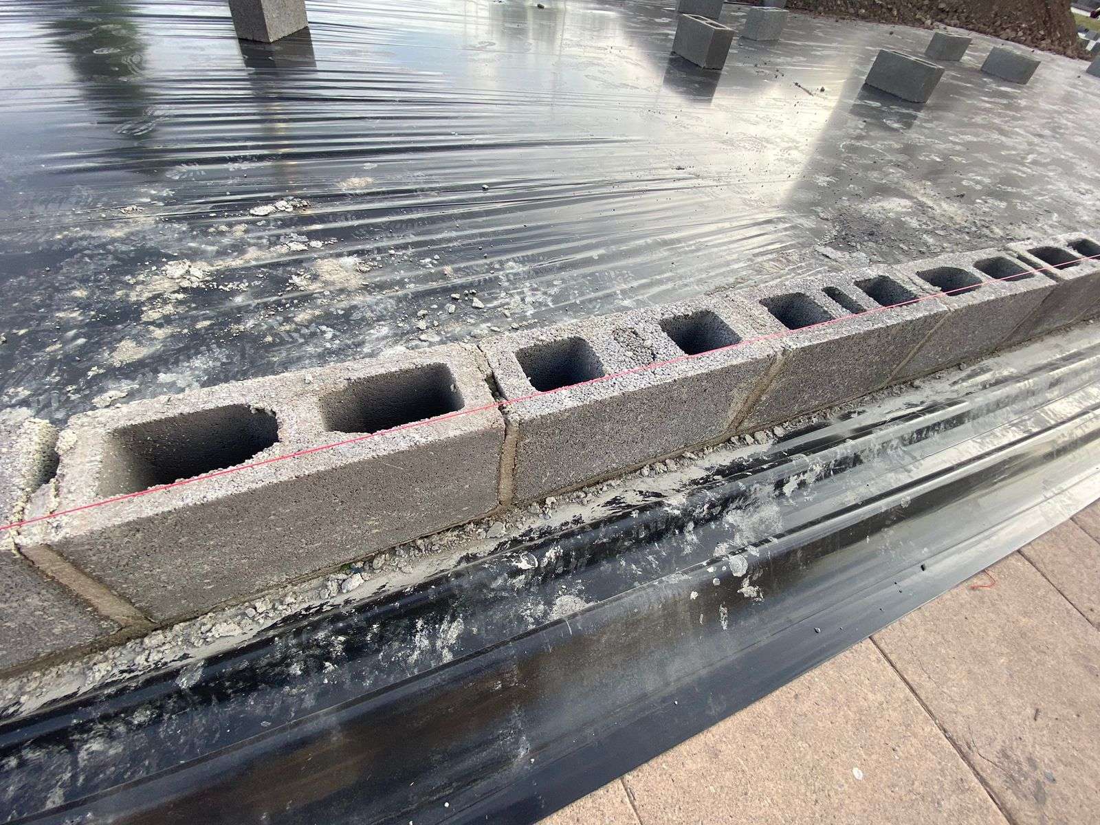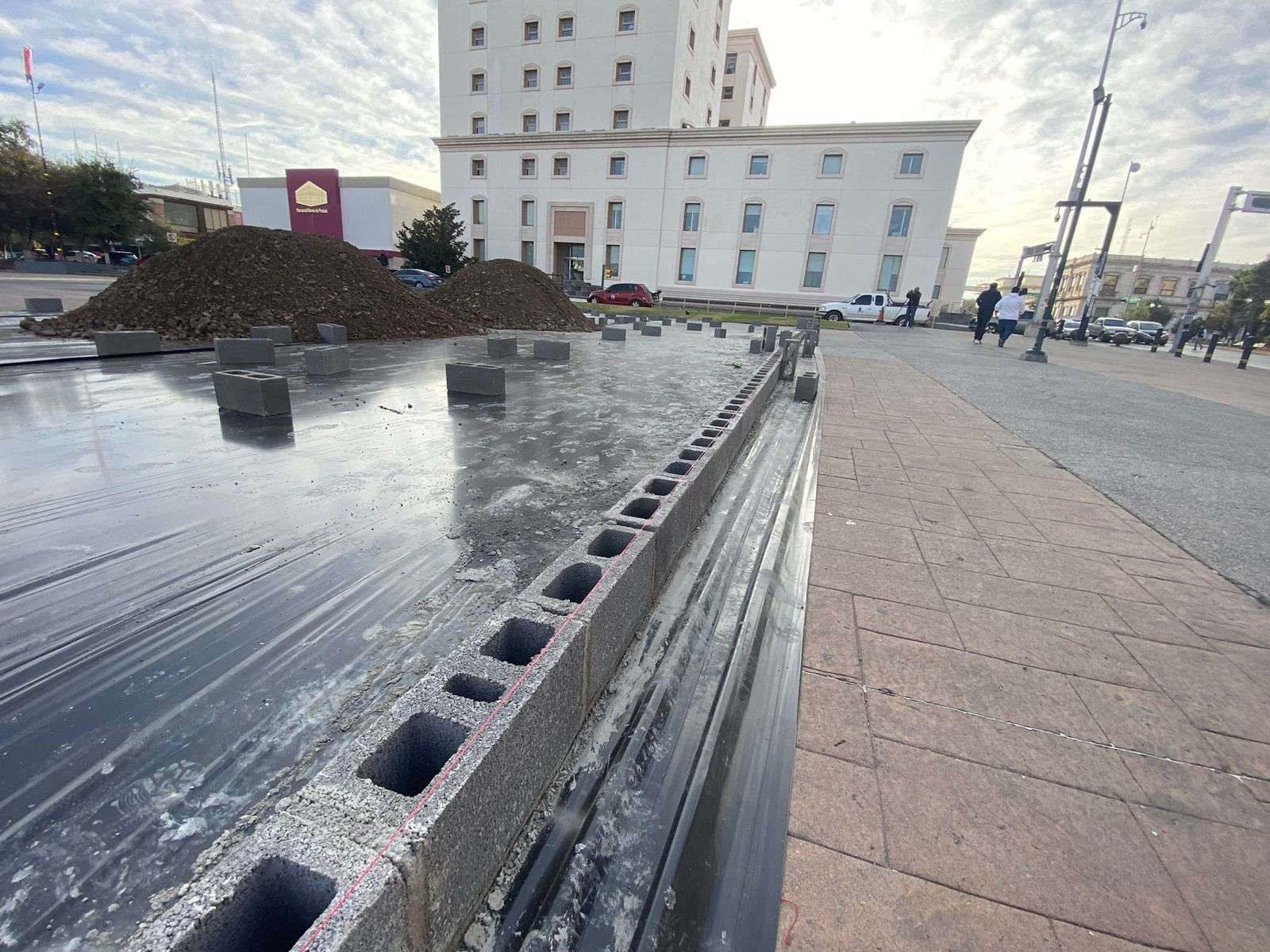 Ya se ha colocado una capa de hule negro en el fondo, además de una hilera de bloques que servirán como base. Posteriormente, se rellenará con arena y se colocará una capa de cemento para la instalación de la carpa y el equipo encargado de congelar la pista.