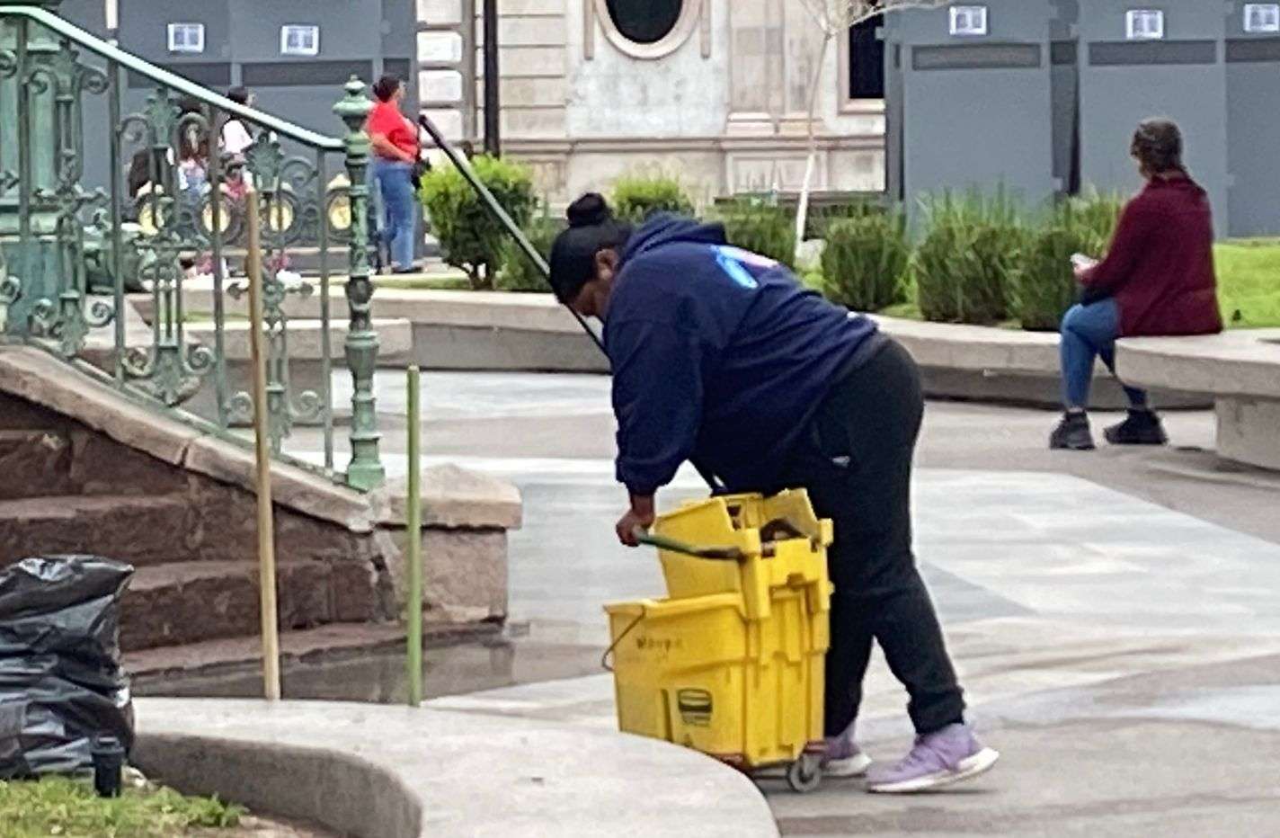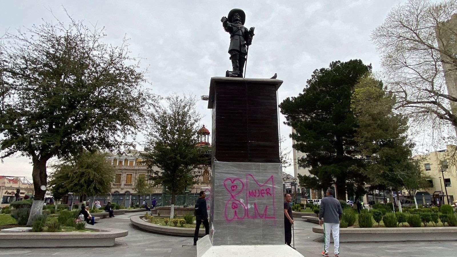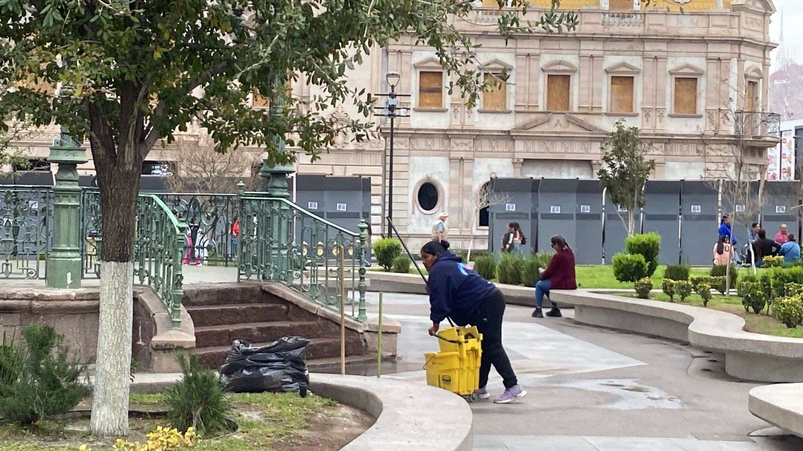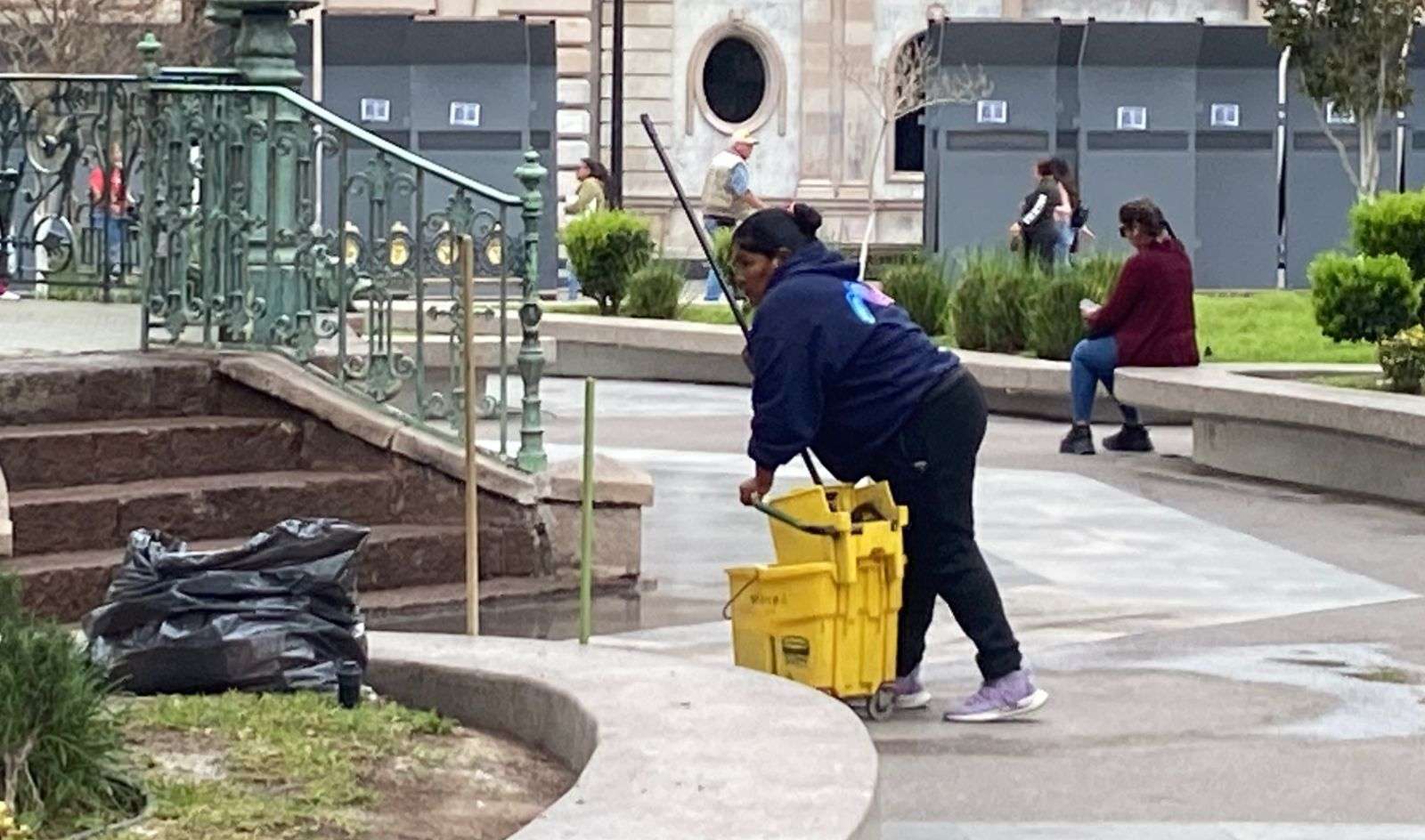 Chihuahua.- Personal del Municipio, realizó este lunes labores de limpieza en la Plaza de Armas, luego de las pintas y rastros que quedaron tras la marcha del Día Internacional de la Mujer, realizada el pasado 8 de marzo en el centro de la ciudad.