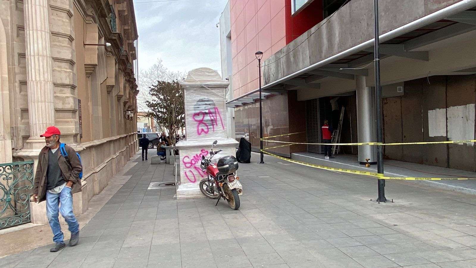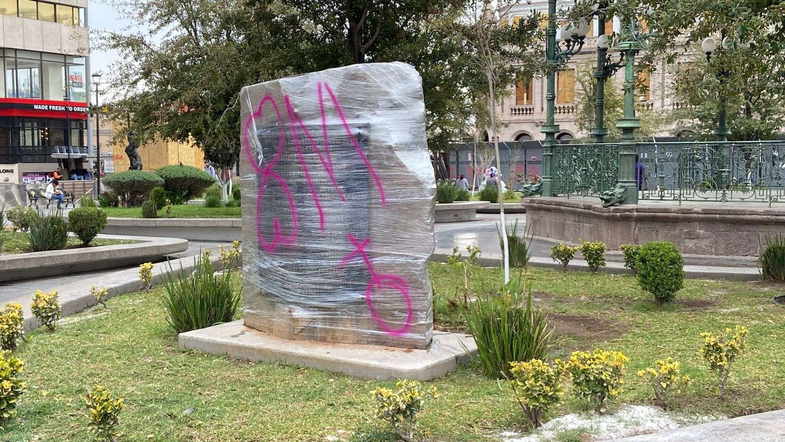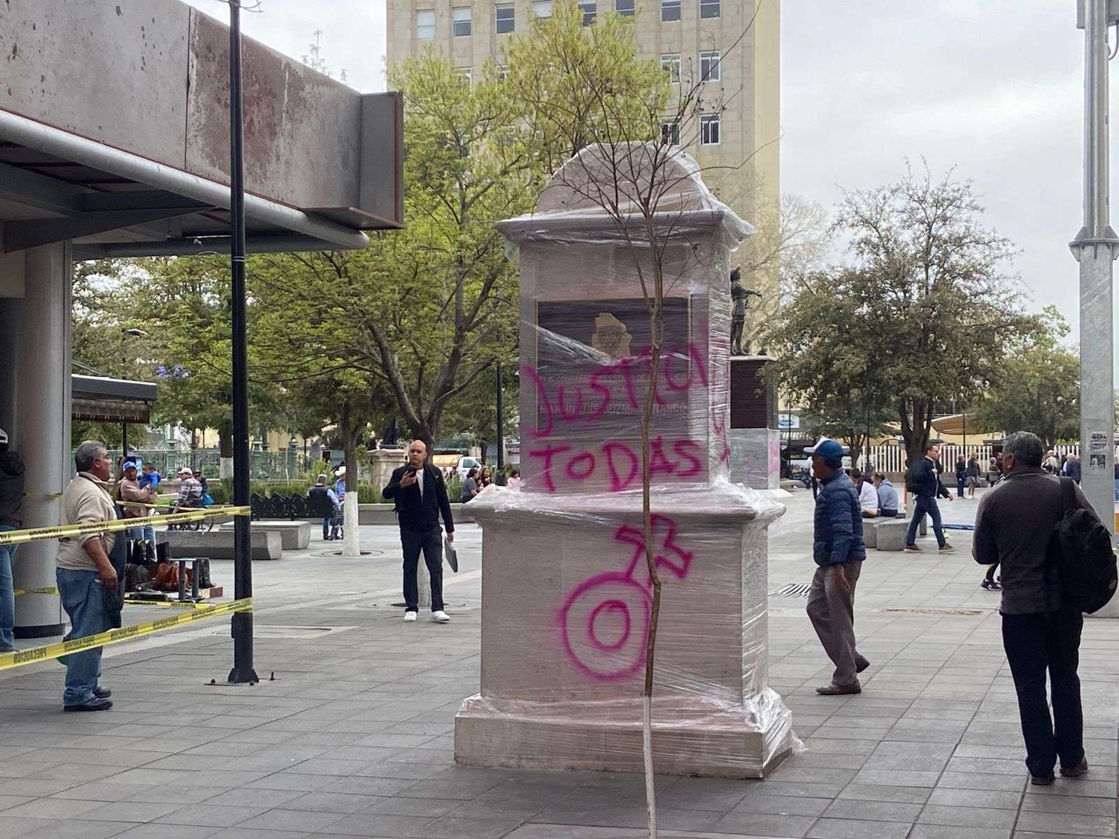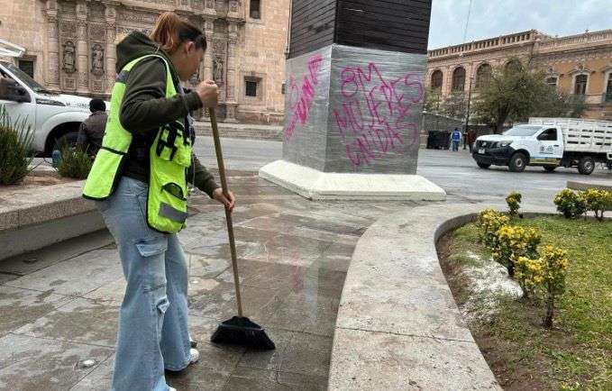 Un día después de la manifestación, algunas paredes, mobiliario urbano y espacios públicos presentaron pintas, por lo que el personal municipal inició las labores de limpieza para retirar los mensajes y residuos que quedaron en la zona.