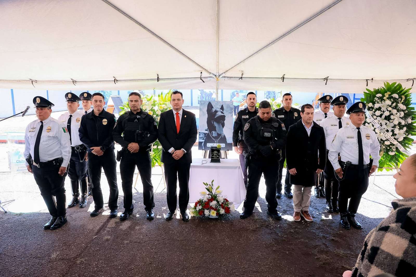 Chihuahua.- El alcalde Marco Bonilla, encabezó una guardia de honor para despedir y reconocer el heroísmo de Vico, perro policía que falleció en cumplimiento del deber tras durante un operativo de atención de violencia familiar en un domicilio ubicado “La Cuadrilla” en el Ejido el Fresno.