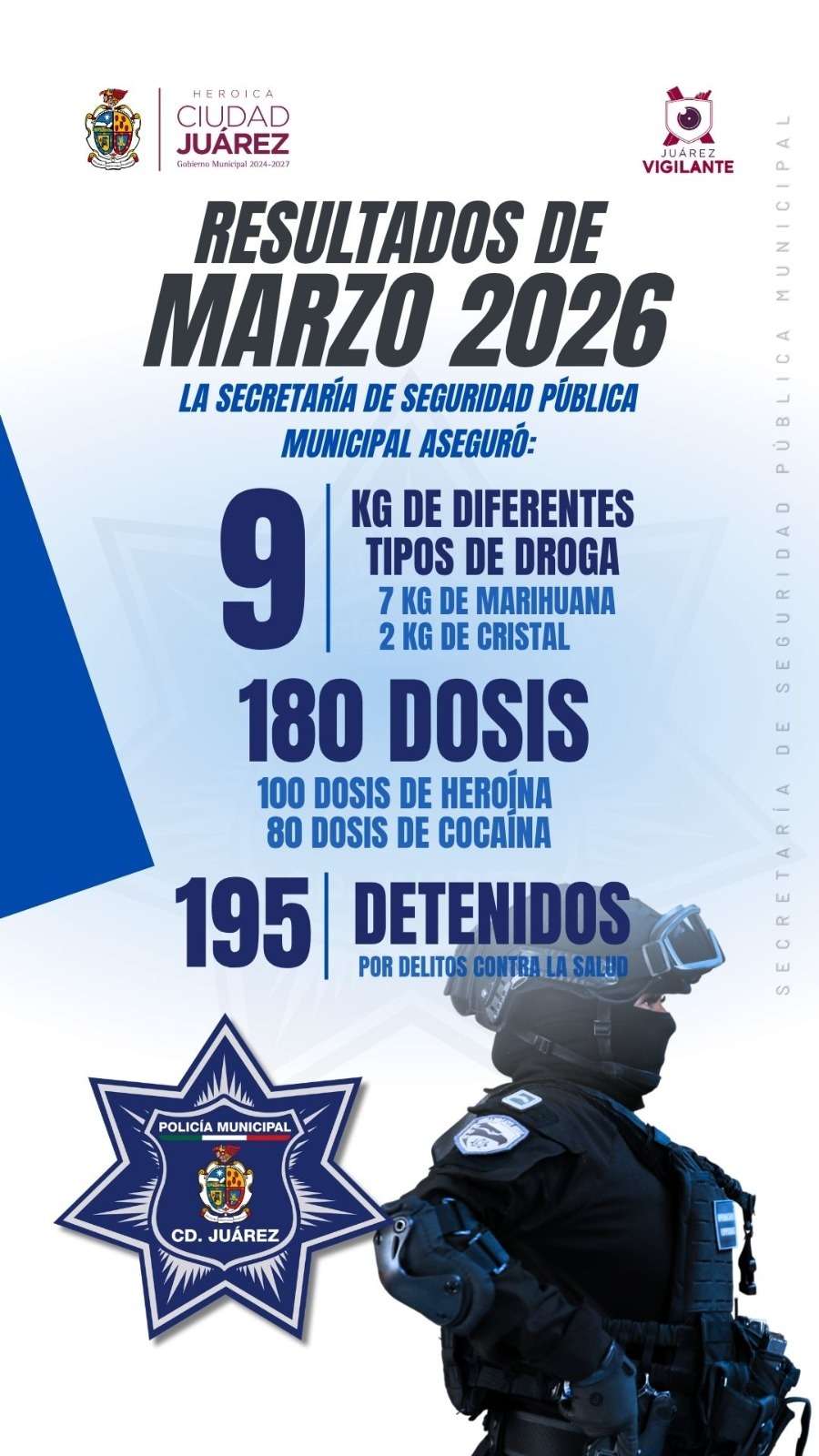 Ciudad Juárez.- La Secretaría de Seguridad Pública Municipal informa a la ciudadanía que, durante el mes de marzo del presente año, se registraron resultados favorables en el combate a los delitos contra la salud, como consecuencia de las acciones permanentes de prevención y vigilancia implementadas en distintos puntos de la ciudad.