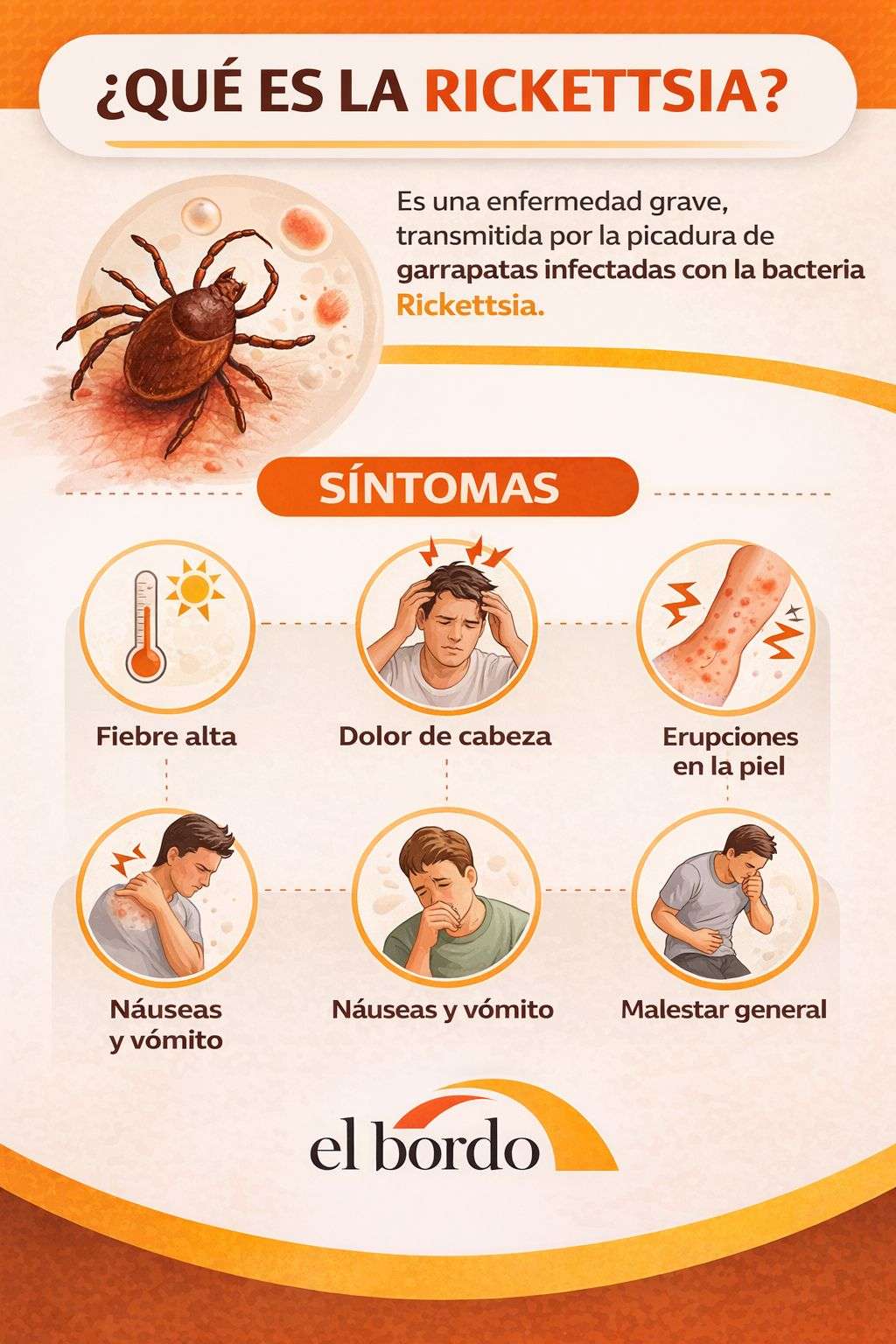 La rickettsiosis es una enfermedad infecciosa que se transmite principalmente por la picadura de garrapatas infectadas, y suele presentarse con síntomas como fiebre, dolor de cabeza, malestar general y erupciones en la piel, por lo que se recomienda acudir de inmediato a recibir atención médica ante cualquier sospecha.