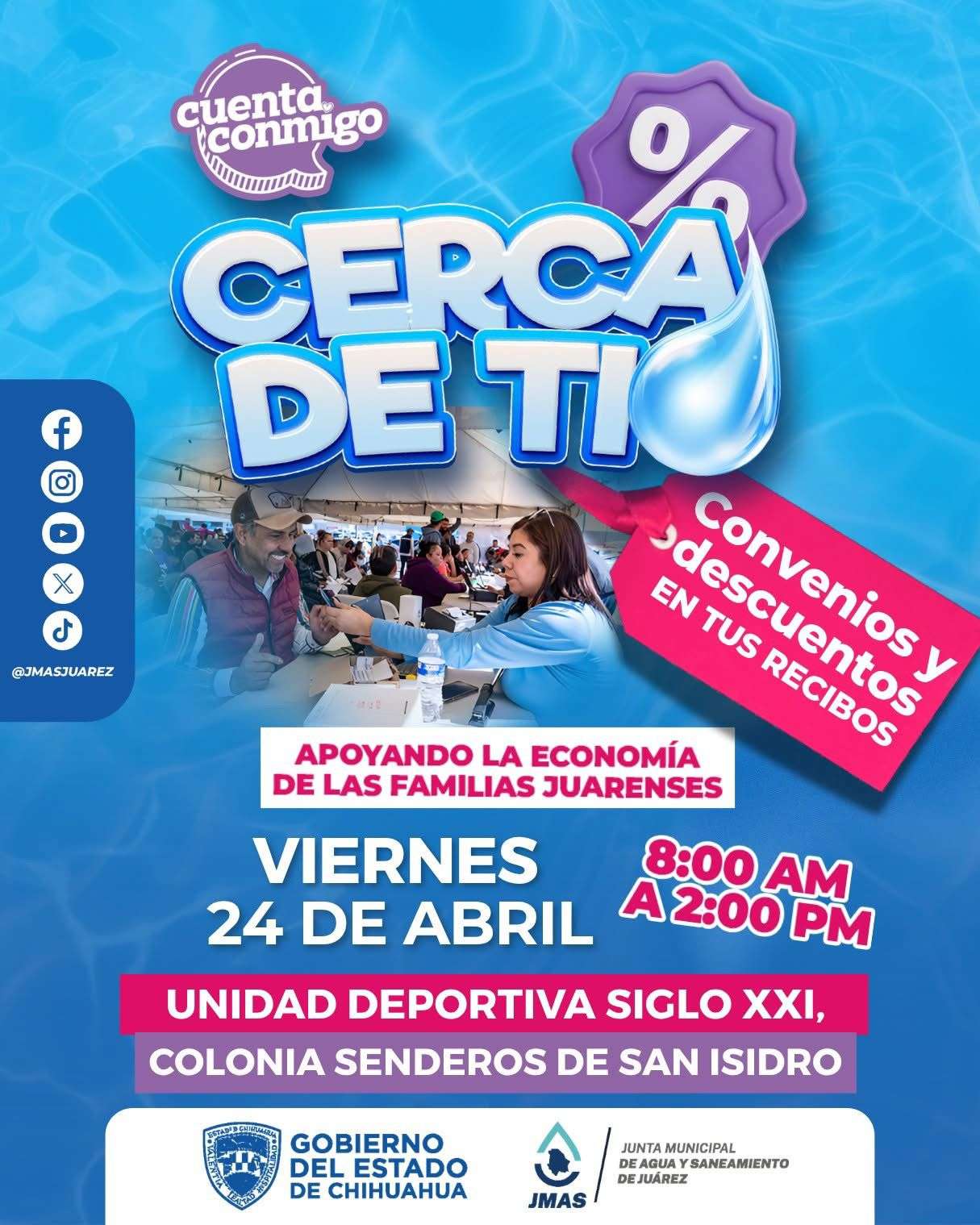 Ciudad Juárez.- Con el objetivo de estar más cerca de las familias juarenses y brindar soluciones reales, la Junta de Agua y Saneamiento de Juárez invita a la ciudadanía a aprovechar la jornada de servicios “Cerca de Ti”, este próximo viernes 24 de abril en la Unidad Deportiva Siglo XXI, ubicada en la calle Monteblanco, en el fraccionamiento Senderos de San Isidro.