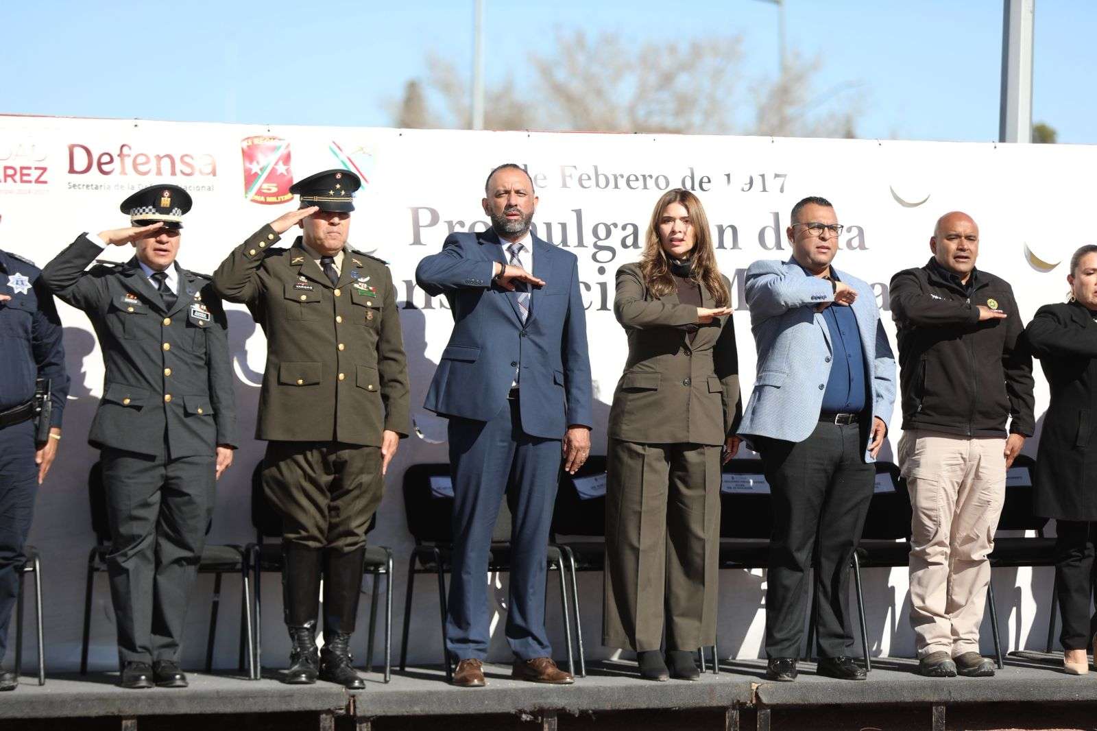 En representación del Presidente Municipal, Cruz Pérez Cuéllar, el secretario del Ayuntamiento, Héctor Rafael Ortiz Orpinel, destacó que el 5 de febrero de 1917 marcó el nacimiento de un nuevo proyecto de nación basado en la justicia social, la libertad, la igualdad y la legalidad, principios que siguen siendo el eje de las políticas públicas y acciones de Gobierno en la actualidad.
