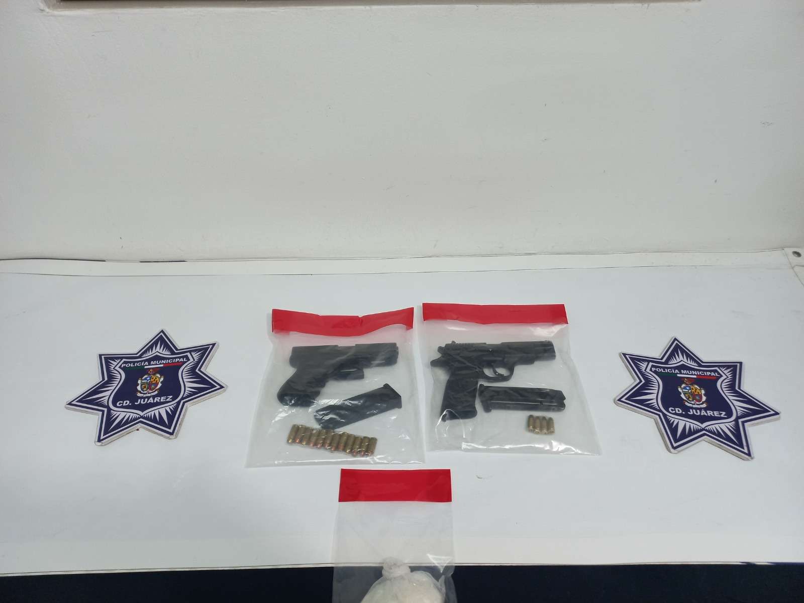 Ciudad Juárez.- Elementos de la Secretaría de Seguridad Pública Municipal arrestaron a Carlos Aaron C. C. y Juan Andrés A. Z., por su presunta responsabilidad en la comisión del delito de posesión de vehículo con reporte de robo, contra la ley federal de armas de fuego y explosivos y por delitos contra la salud.
