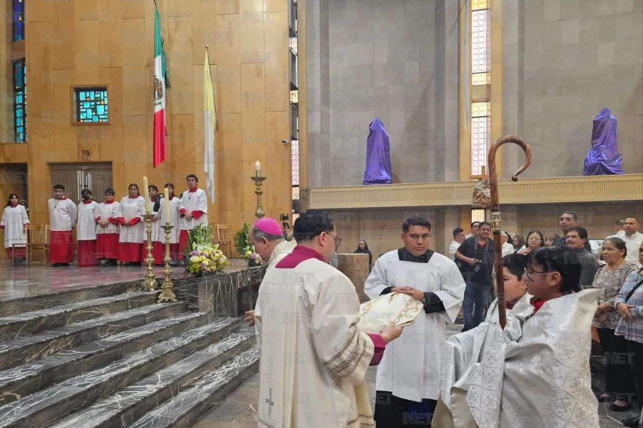 Ciudad Juárez.– En el marco de las celebraciones del Jueves Santo, el obispo de la diócesis, José Guadalupe Torres Campos, encabezó la ceremonia litúrgica en la Catedral, donde se llevaron a cabo los ritos de bendición del pan y el tradicional lavatorio de pies, actos que forman parte del inicio del Triduo Pascual.