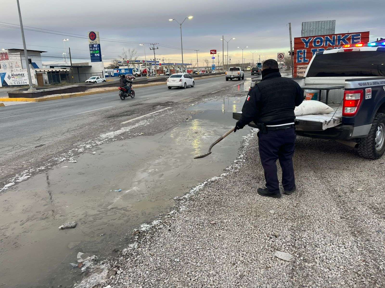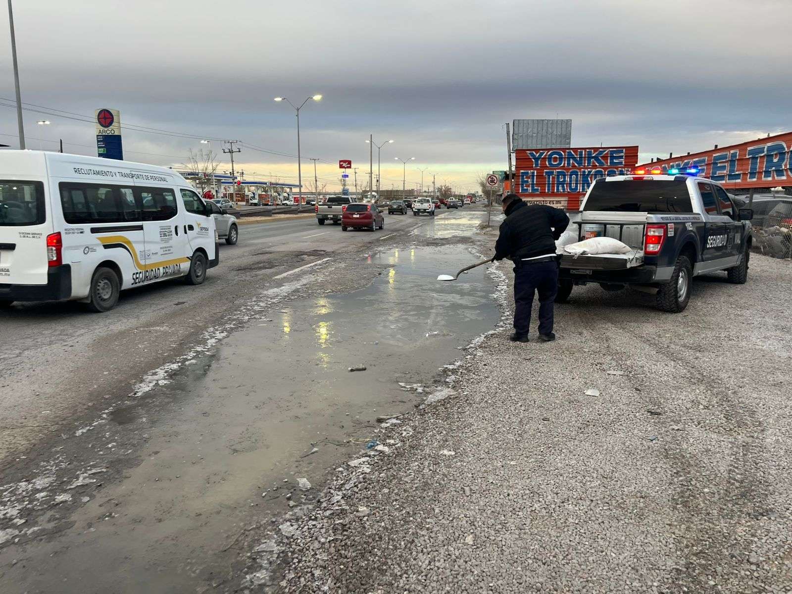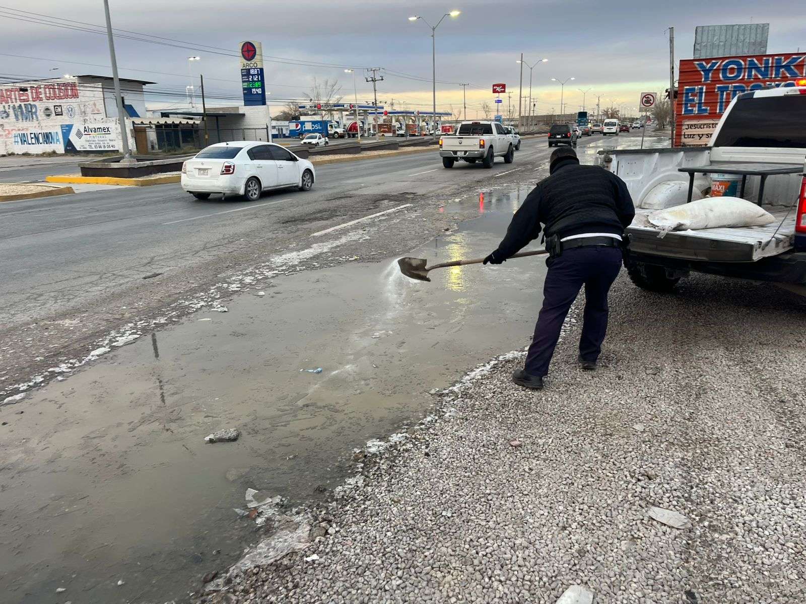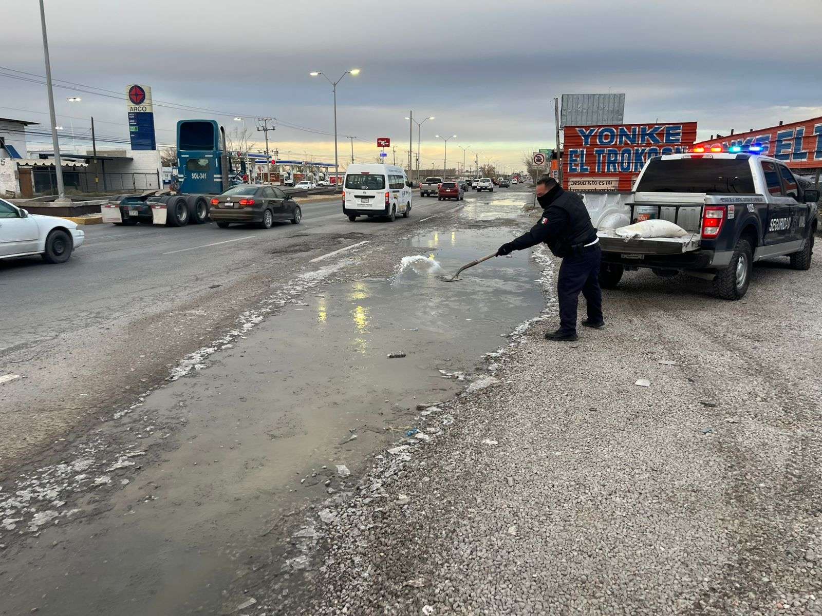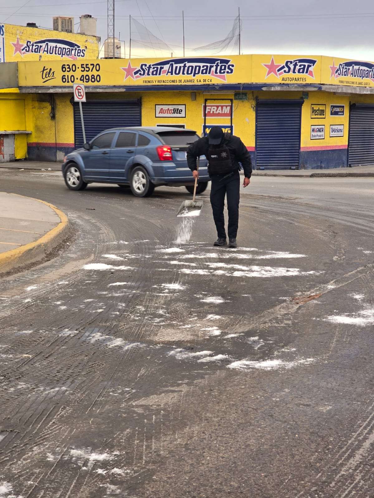Ciudad Juárez.- Con la finalidad de evitar cualquier tipo de incidentes, agentes de la Coordinación General de Seguridad Vial, esparcieron sal sobre vialidades que presentaban hielo y a su vez representan peligro tanto para conductores como peatones.