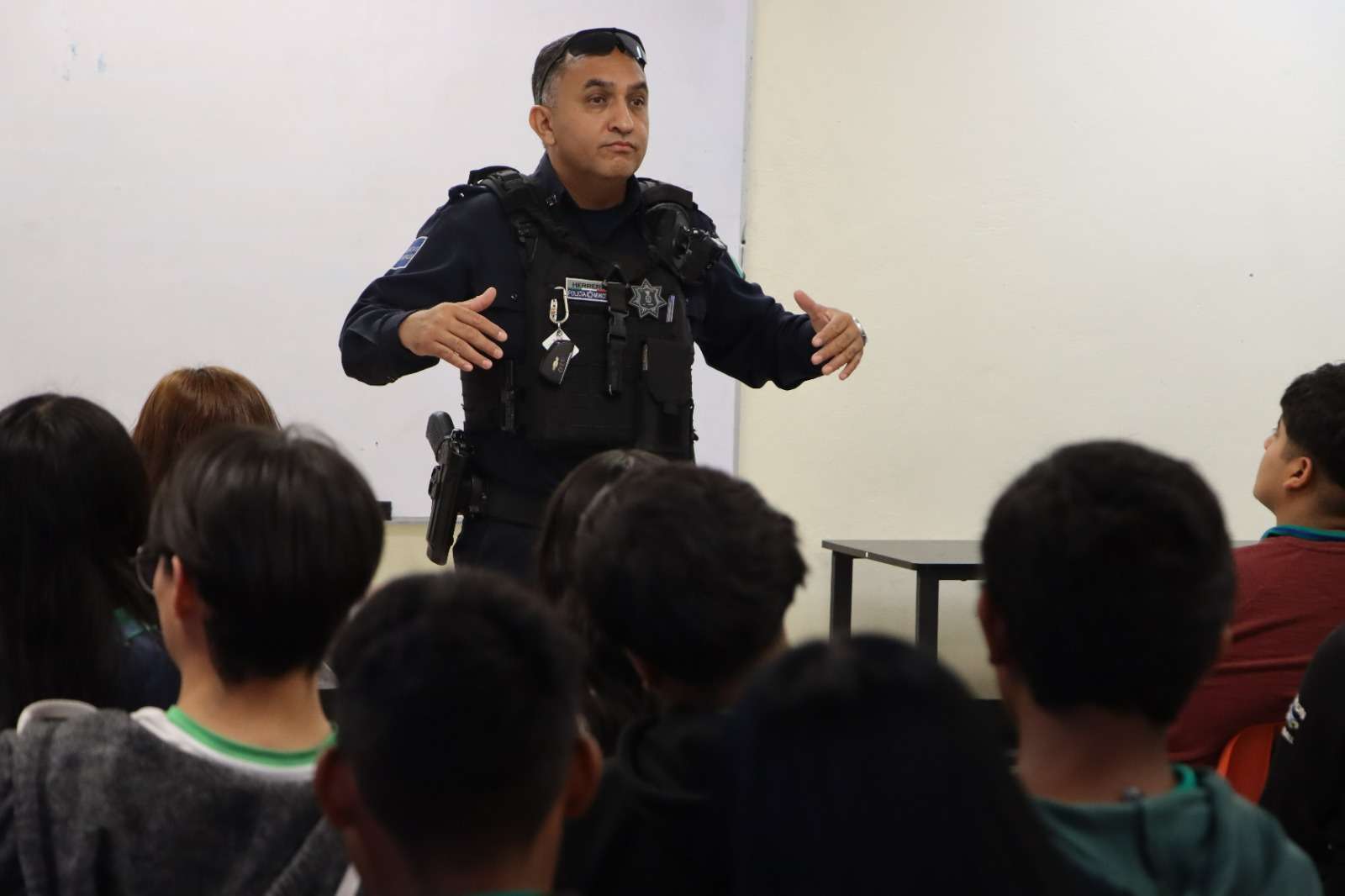 Ciudad Juárez.- Con el objetivo de fomentar una cultura de respeto y prevenir la violencia escolar, la Secretaría de Seguridad Pública Municipal a través de la Dirección de Prevención Social, impartió una plática informativa a estudiantes de la preparatoria CECyTECH Plantel 7, ubicado en las calles Morelos y Guadalupe Victoria, en el poblado de San Isidro.