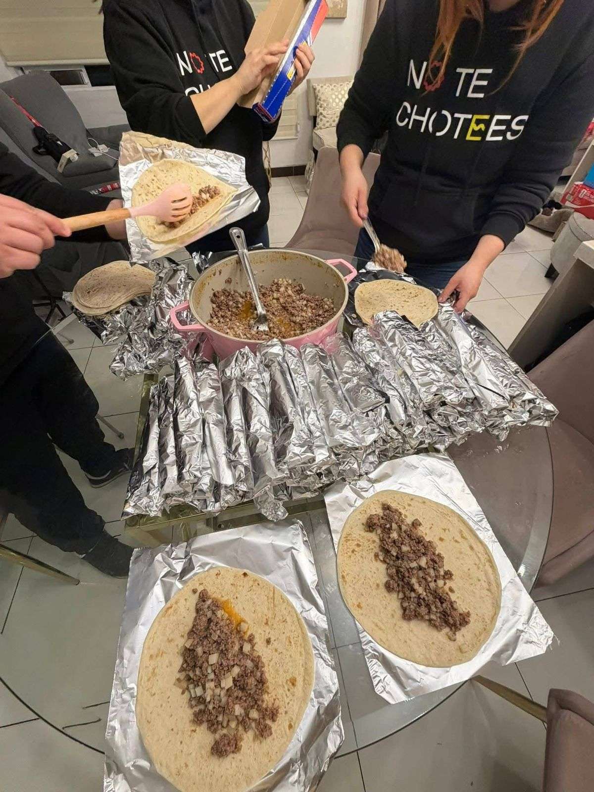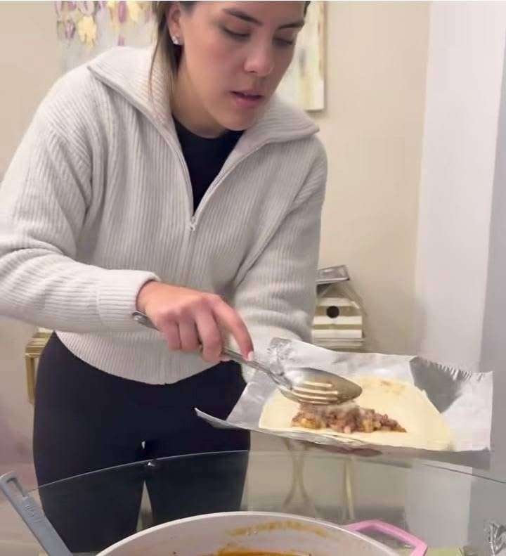 Los guisados fueron hechos en casa y transformados en burritos que ella misma ayudó a empacar, demostrando que la ayuda va más allá de una publicación en redes sociales.