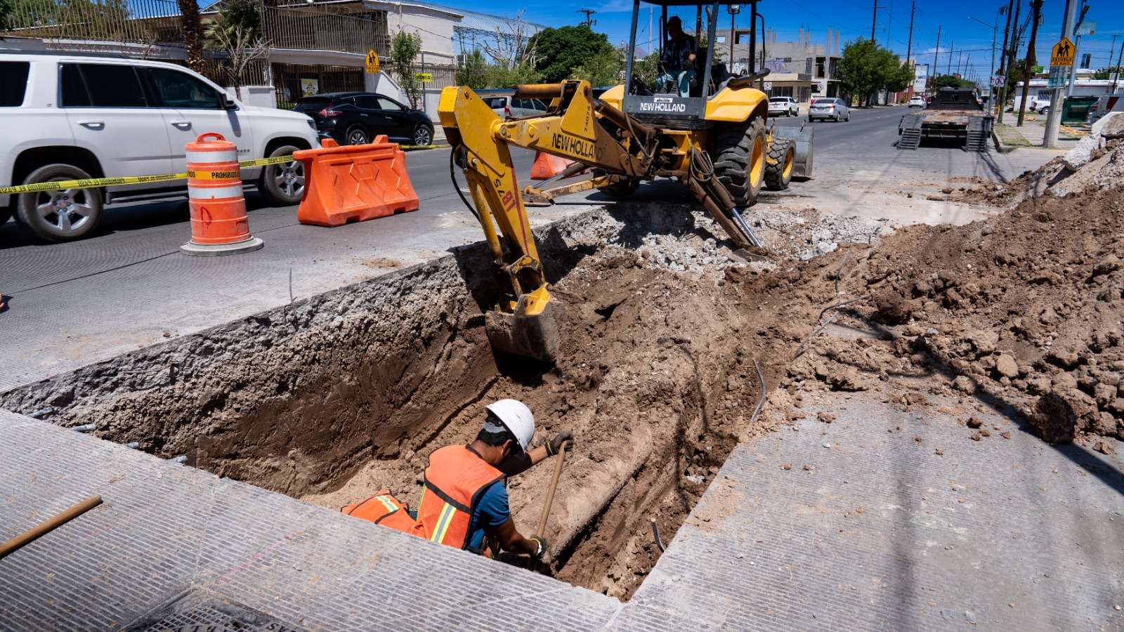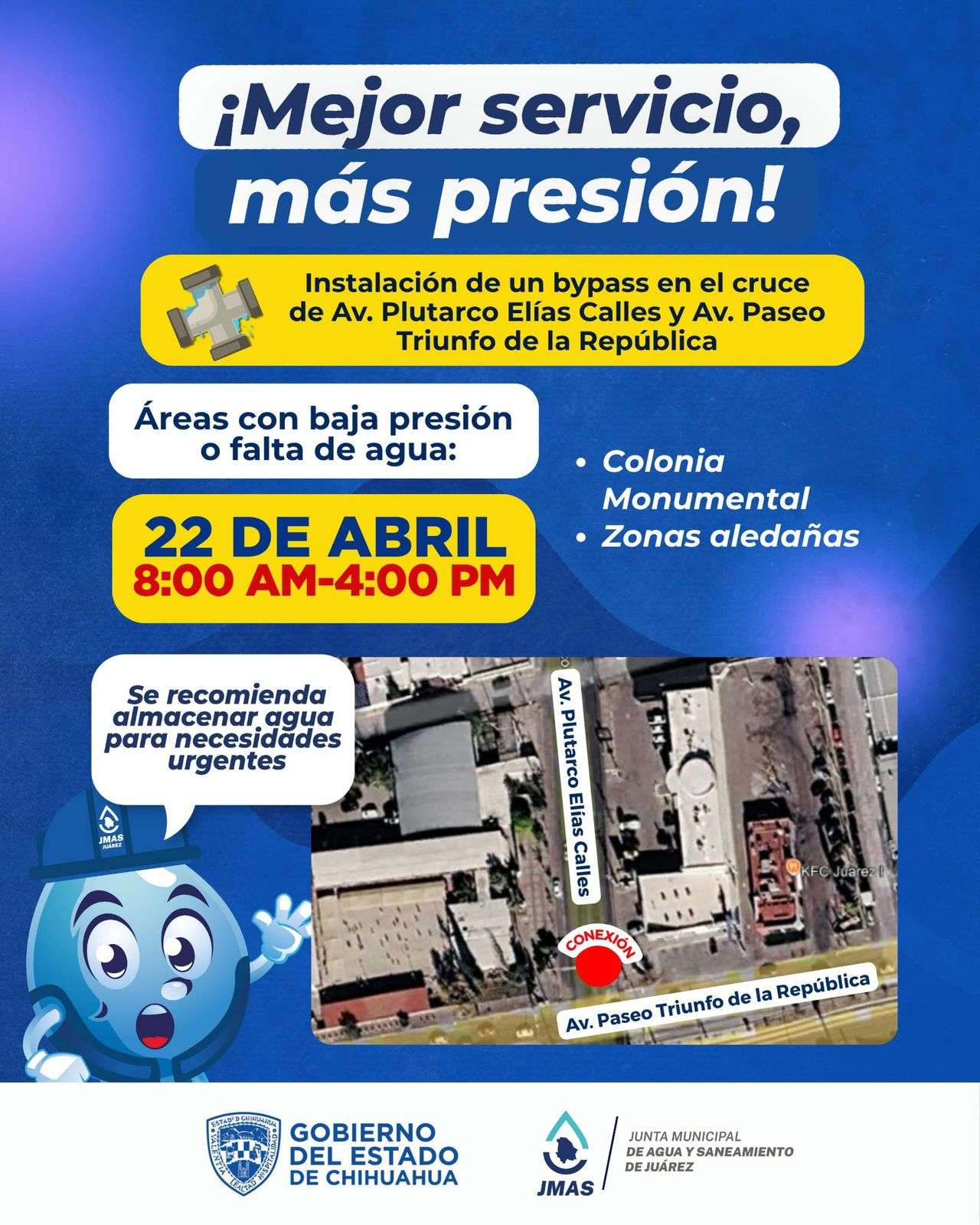 Estas labores continúan sobre la Av. Paseo Triunfo de la República, sin embargo, este próximo miércoles 22 de abril se continuará con la instalación de una conexión entre tuberías (bypass) sobre el cruce de Av. Plutarco Elías Calles y Av. Paseo Triunfo de la República, lo que causará suspensión de servicio en colonia Monumental y zonas aledañas, invitando a la comunidad a hacer acopio de agua para las necesidades básicas.